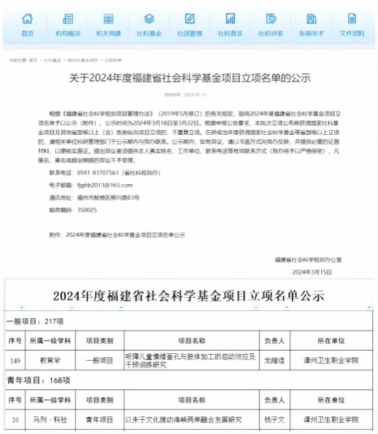 近日,福建省社科联公示了2024年度福建省社会科学基金项目拟立项项目,我校2个项目入选。其中,龙细连教师申报的《听障儿童情绪面孔与肢体加工的启动效应及干预训练研究》获一般项目立项,钱子文教师申报的《以朱子文化推动海峡两岸融合发展研究》获青年项目立项。
