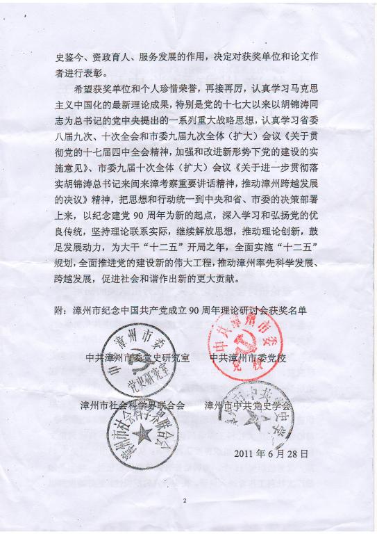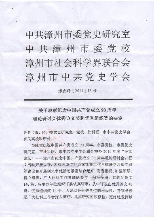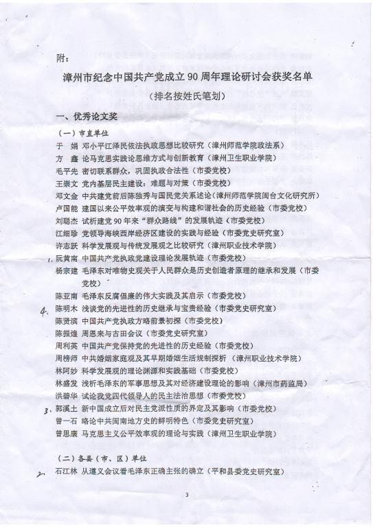 漳州市纪念中共成立90周年获奖论文