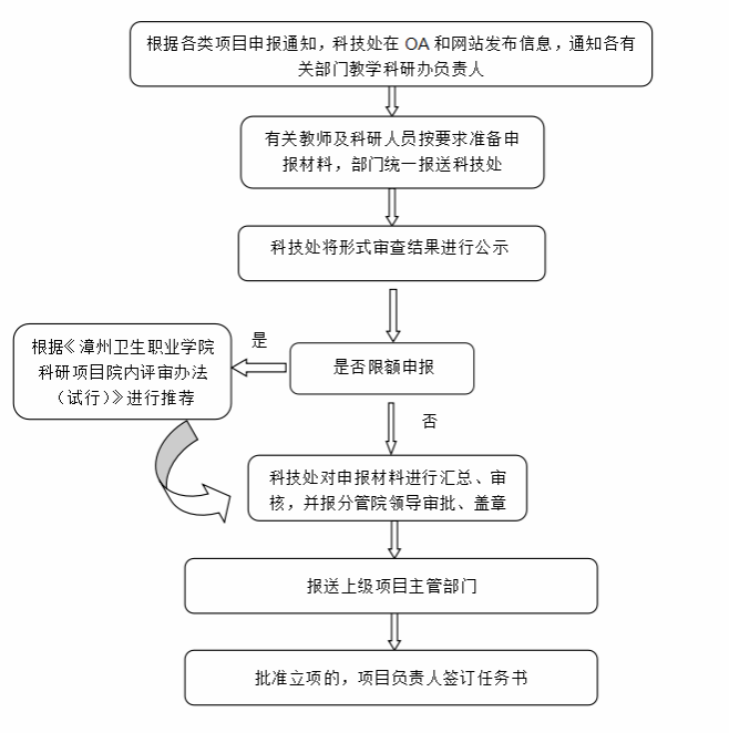 注:院级科研项目参照此流程,院级项目参照《漳州卫生职业学院科研项目院内评审办法(试行)》进行评审。