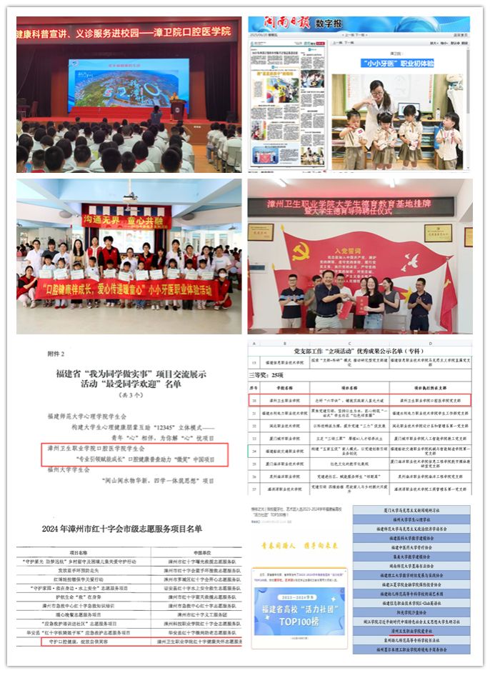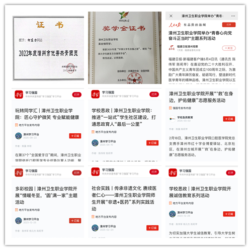 校地共建,服务网络“广”与漳州市残联共建助残志愿服务队,常态化开展扶残助残活动;与和平里社区共建“社区健康服务驿站”,坚持每周二进驻开展义诊与健康讲座;与新建村党支部共建“德育基地”,常态化组织“三下乡”社会实践曾获省级优秀团队称号