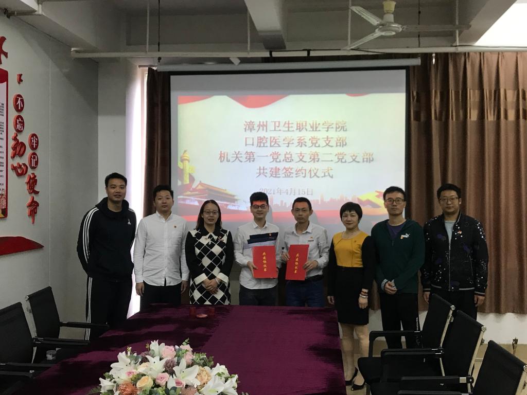 为深入贯彻习近平新时代中国特色社会主义思想和党的十九届五中全会精神,促进党建活动高质量发展,探索党建工作新思路新方法。4月15日,口腔医学系党支部与机关第一党总支第二党支部举行共建签约仪式。会议由口腔医学系党总支书记陈莉苹主持,两个支部全体支委参加。