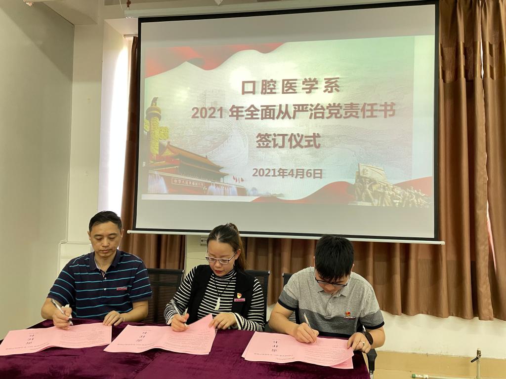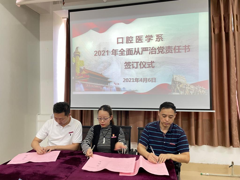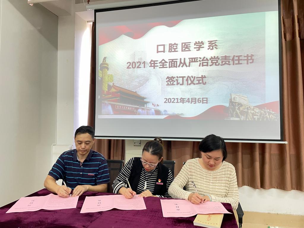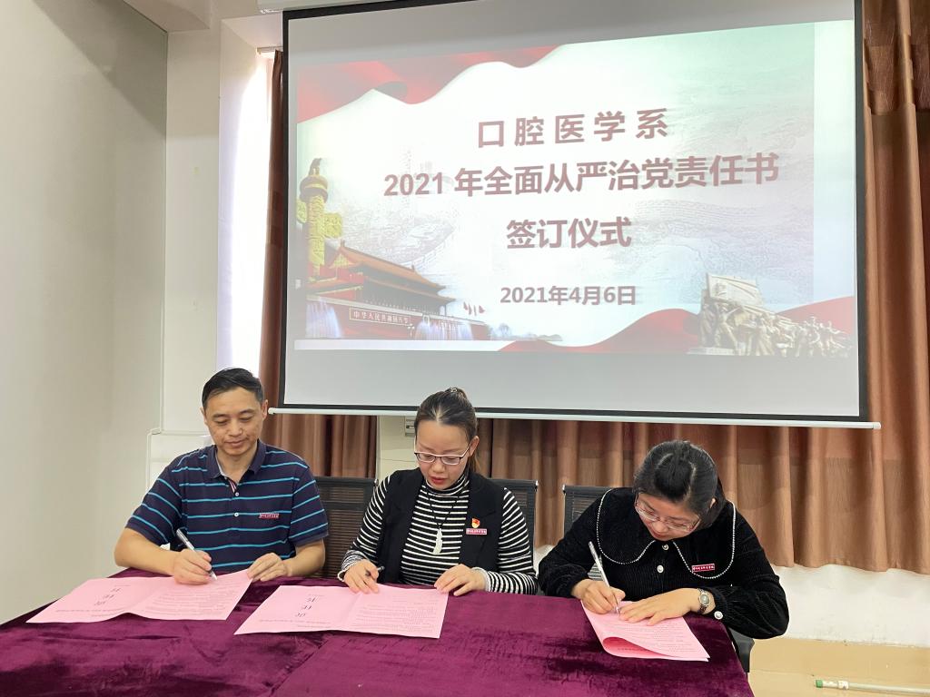 会上,陈莉苹回顾总结系部成立以来全面从严治党工作,强调了落实全面从严治党的重要意义,并为2021年全面从严治党工作做了部署安排。随后,系党总支书记、系副主任与各党支部书记、教研室主任、实训中心主任、系办负责人、党建办负责人、学工办负责人签订了口腔医学系2021年全面从严治党责任书。