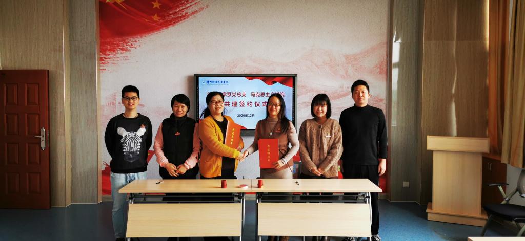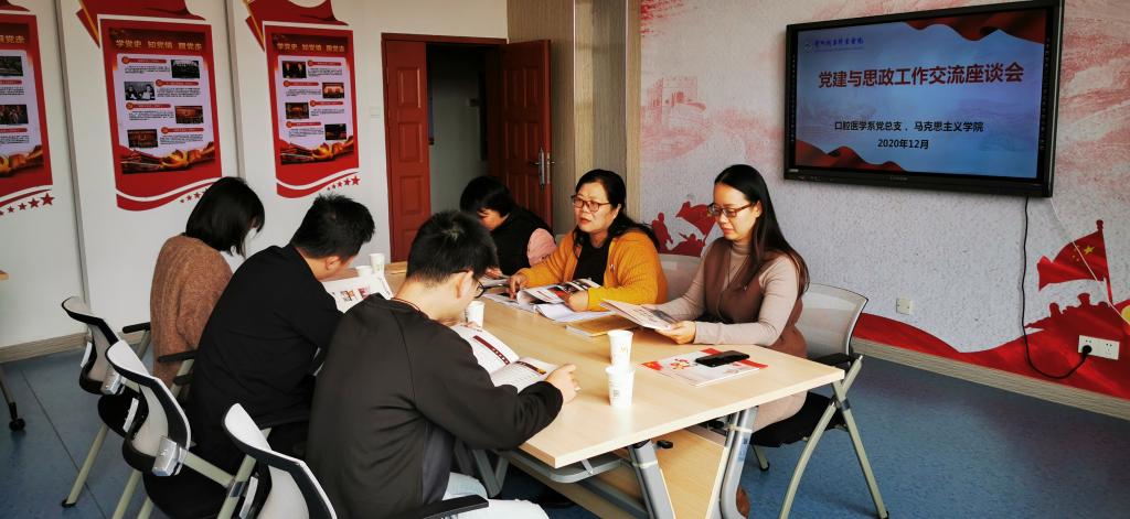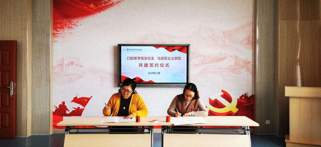 为深入学习贯彻习近平新时代中国特色社会主义思想和党的十九届五中全会精神,扎实开展“不忘初心、牢记使命”主题教育,发挥党建与思政同向同行的协同联动效应,实现资源融通,凝聚育人合力。口腔医学系党总支与马克思主义学院于12月18日上午在学院党建活动中心党员活动室举行共建签约仪式,口腔医学系党总支陈莉苹书记、马克思主义学院张绿文院长及相关老师出席签约仪式。