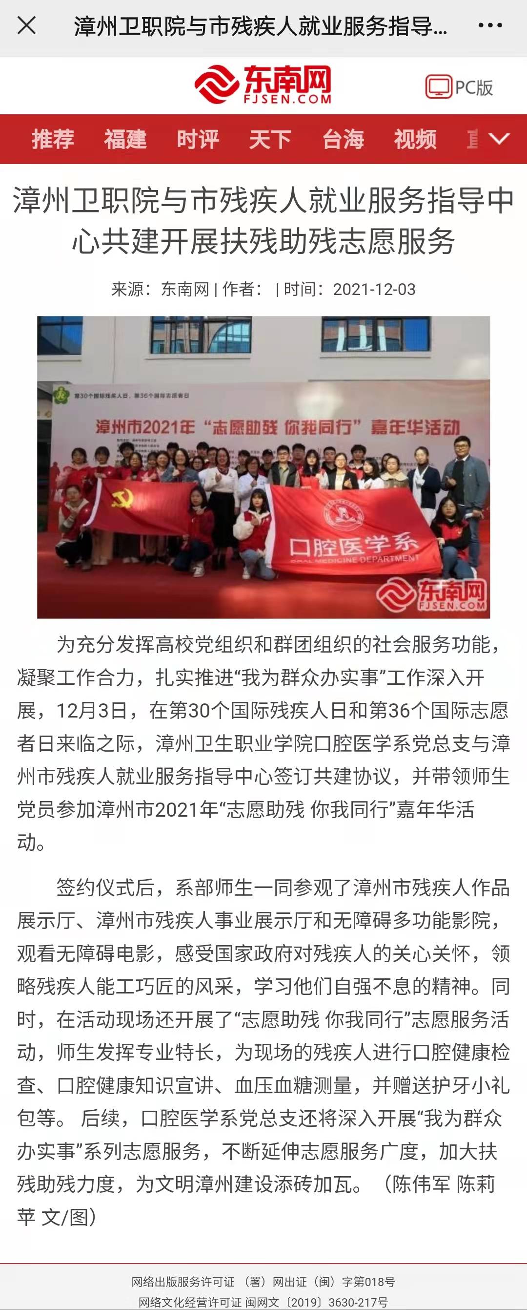 东南网:漳州卫职院与市残疾人就业服务指导中心共建开展扶残助残志愿服务