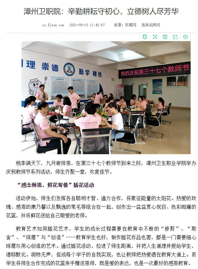 2021年9月13日,《东南网》刊发题为《漳卫职院:辛勤耕耘守初心,立德树人尽芳华》的教师节活动报道,报道如下: