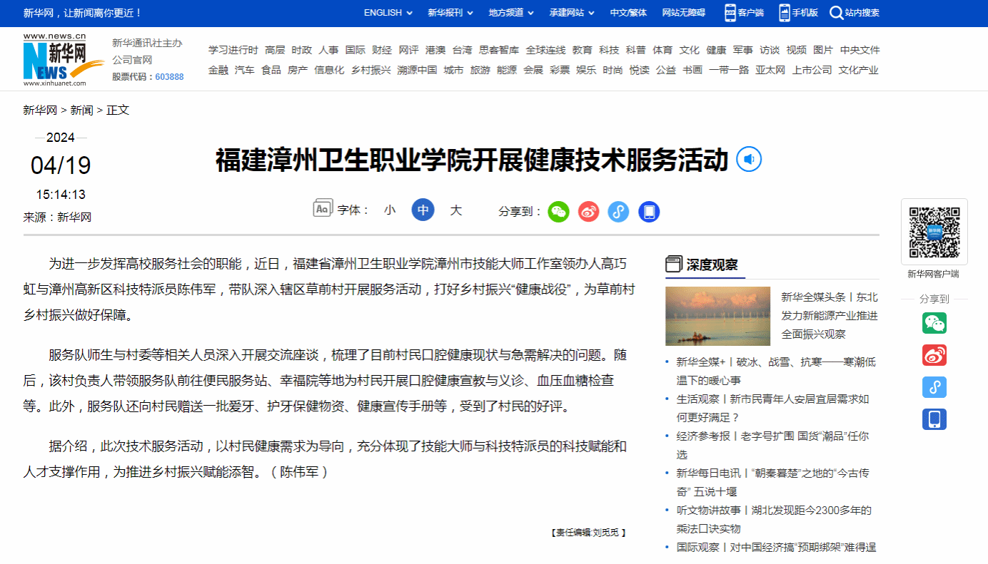 新华网:福建漳州卫生职业学院开展健康技术服务活动