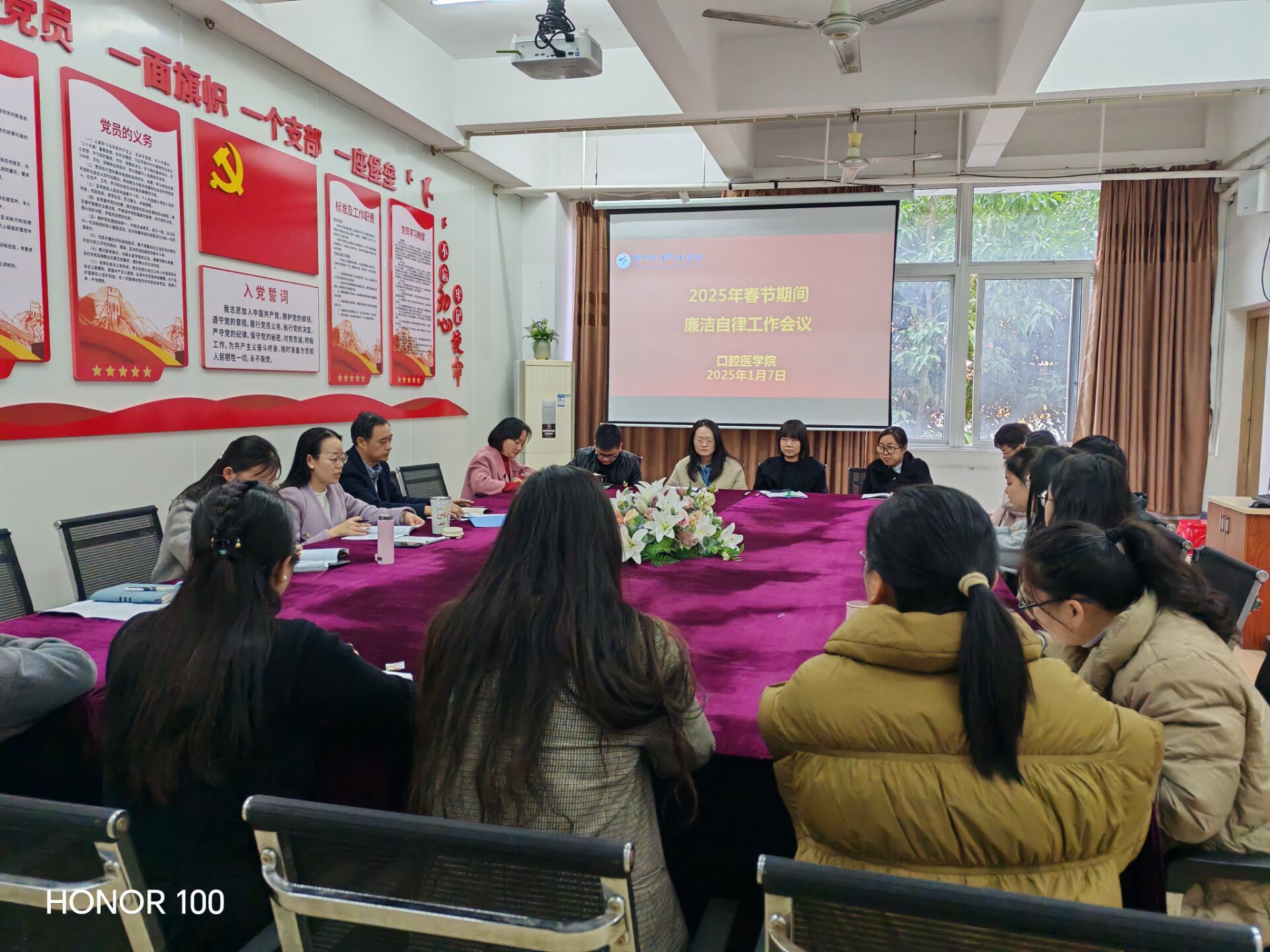 为进一步贯彻落实中央八项规定精神及其实施细则,纠治节日期间滋生的“四风”问题,营造风清气正的教书育人环境和节日氛围,1月7日,口腔医学院在致馨楼209会议室召开全体教职工2025年春节前廉洁自律会议。