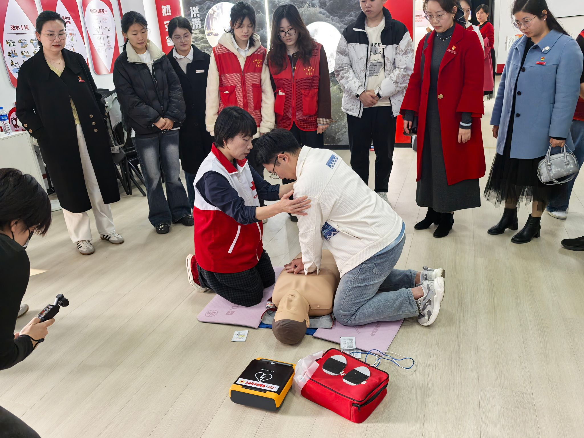 活动当天,党员师生团队联合芗城区北京社区、漳州市红十字会博爱驿站等在古城设立临时志愿服务点,邀请景区游客、社区居民及商户等共同走进"黄金四分钟"急救课堂,学习心肺复苏、AED和气道异物梗阻处理等实用技能,并发放急救知识手册;同时设立义诊服务站,由党员头雁工作室、党员先锋岗老师带领先锋志愿服务队成员,为群众提供血压血糖测量、口腔健康宣教等服务,惠及群众数百人次。活动特别设计"健康福袋",内含速效救心丸、急救用品以及家庭急救指南等,为群体送上贴心关怀,用实际行动诠释"健康中国"的深刻内涵。