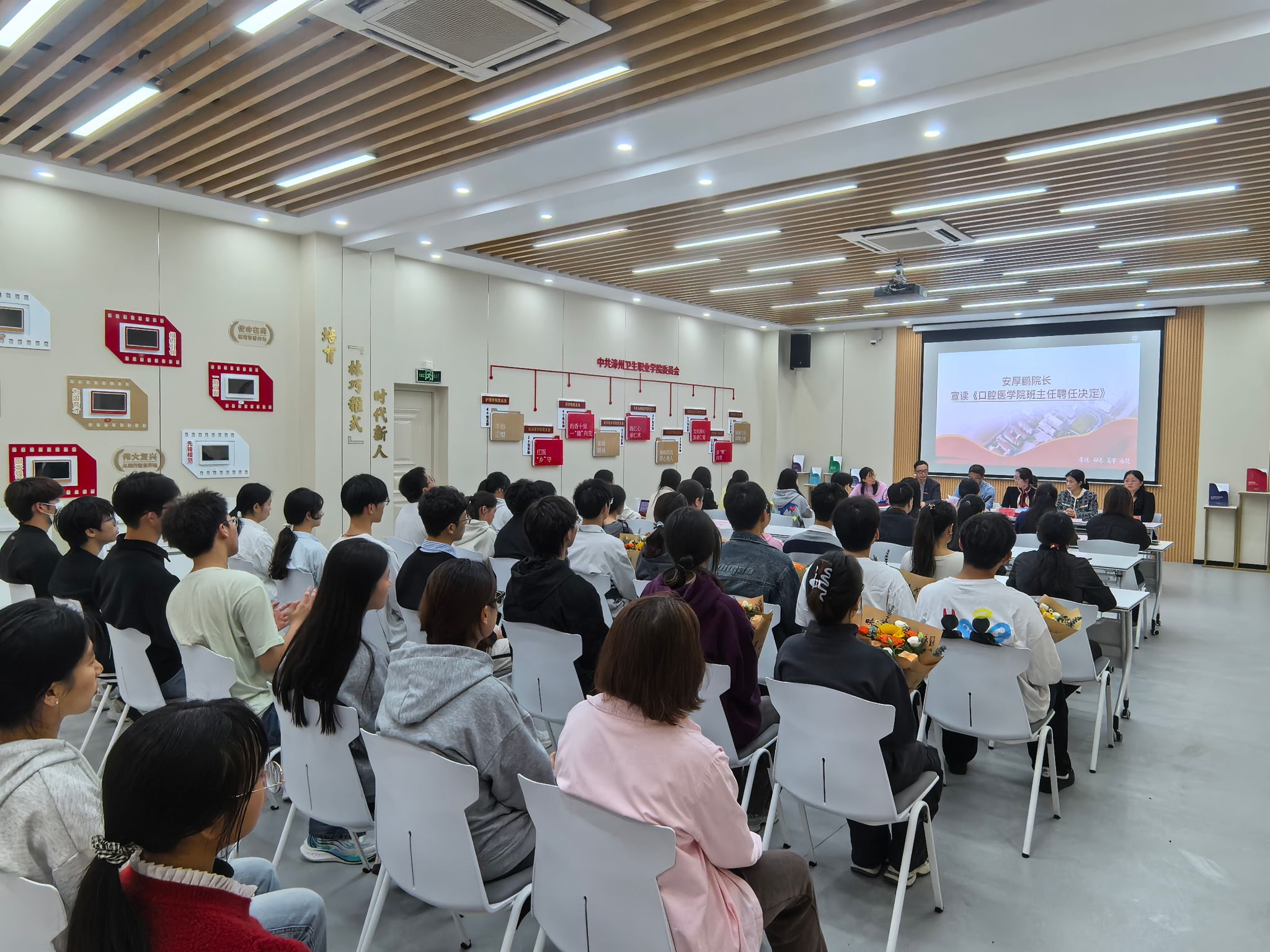 为加强班主任队伍建设,推动学生管理工作高质量发展,3月4日,我院在图书馆一楼智慧党建展示厅举行班主任聘任仪式。学校纪委书记宋志海出席仪式并讲话。学生工作部、口腔医学院师生代表出席了会议。