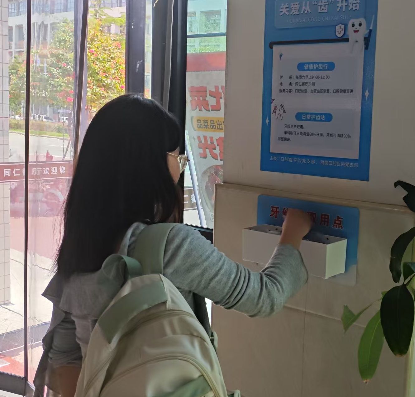 3月13日,在校园食堂的出口处,一组印有“关爱从‘齿’开始”标语的盒子吸引师生驻足,盒内摆放的独立包装牙线供免费取用。这是口腔医学院党支部和附属口腔医学院党支部推进“我为群众办实事”实践活动的重要举措之一,通过将专业特色融入惠民服务,切实提升师生口腔健康意识,构筑校园健康防线。