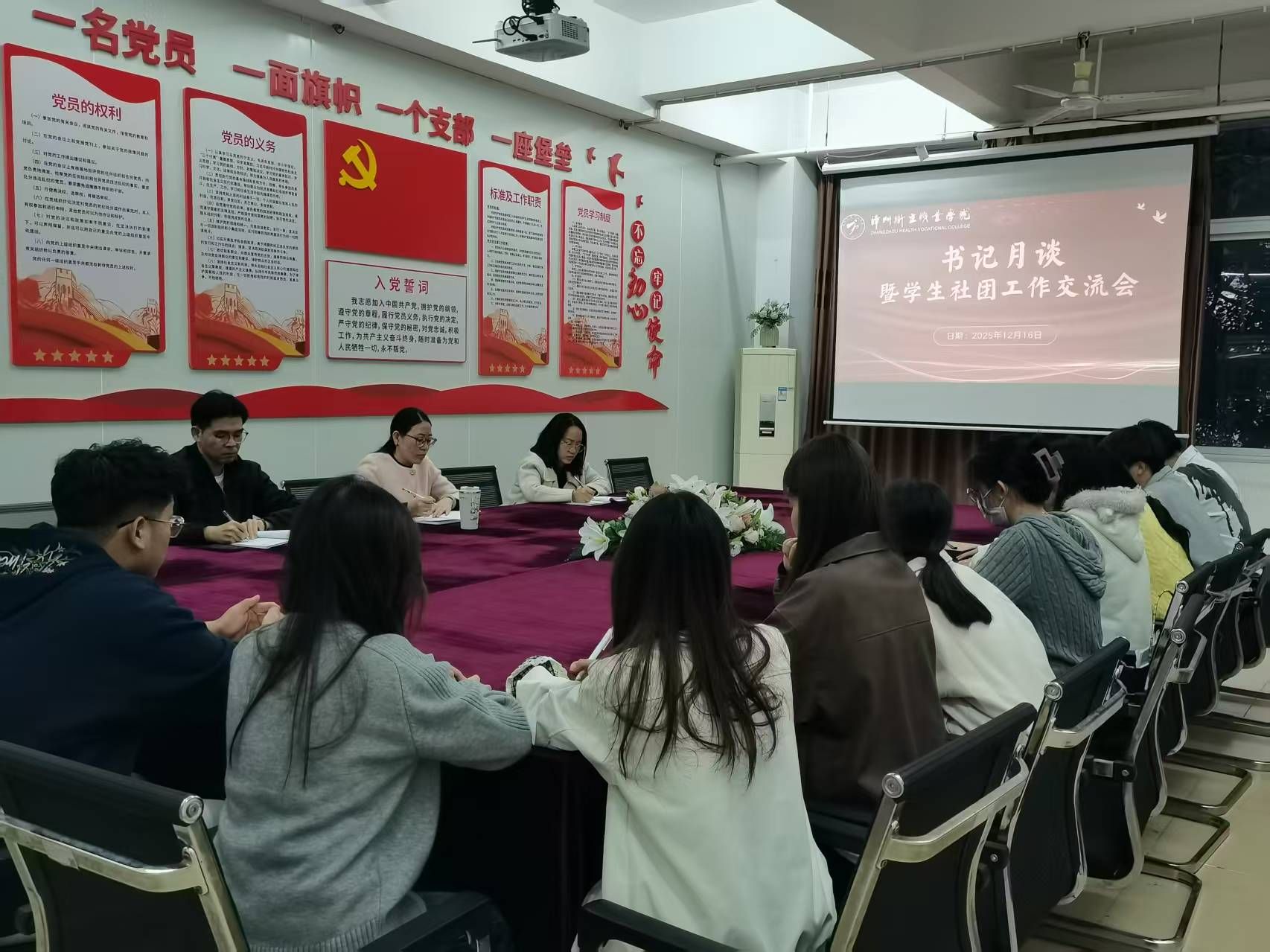 12月16日,我院党总支在致馨楼208会议室召开“书记月谈”暨学生社团工作交流会” 顺利召开。学院党总支书记、学工办主任、辅导员及学生会、自律会等多个社团骨干代表参会。会议旨在了解学生社团工作实际,聚焦发展难题,凝聚思想共识,形成育人合力。