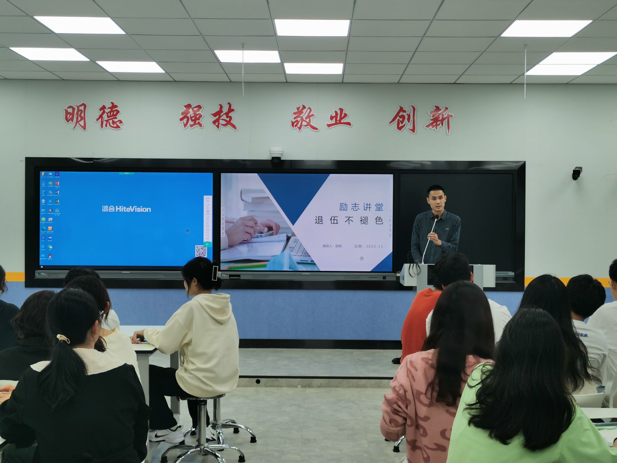 会上,张桢校友为大家分享了自己从参军入伍到返校学习,再到实习就业的一系列心路历程,结合自身经历,与在座的大一新生就学习、实习和就业的问题进行了经验分享。鼓励学弟学妹们树立自己的人生目标,充分利用在校资源学好专业知识,掌握专业技能,提高自己的职业竞争力。同时结合自己的参军入伍经历,为大家分别介绍了在校大学生和大学毕业生参军入伍的政策方针,鼓励学弟学妹树立远大理想,投身军旅,报效国家。