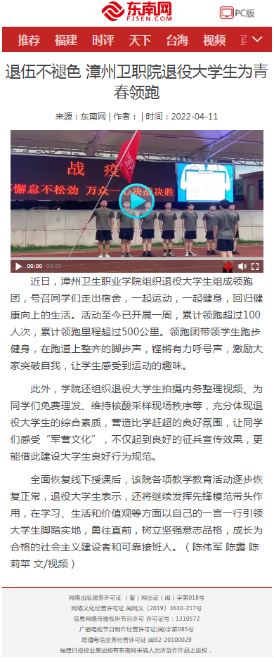 东南网:退伍不褪色 漳州卫职院退役大学生为青春领跑