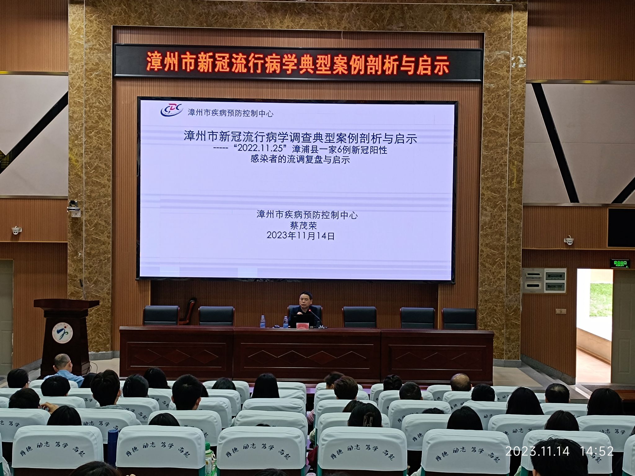 我院全体教职员工和2022级高职预防医学1、2班集体聆听。蔡书记结合2022年11月25日漳浦县一家6例新冠阳性感染者的流调复盘与启示,案例分析全面,数据精准详实,深入浅出地将复杂的突发新冠疫情流调过程讲解清楚。整个流调过程在讨论确定家庭首发病例、感染途径、传播过程等等环节,就像出色的侦探在侦破复杂案件一样引人入胜。老师和同学们聆听得都津津有味。