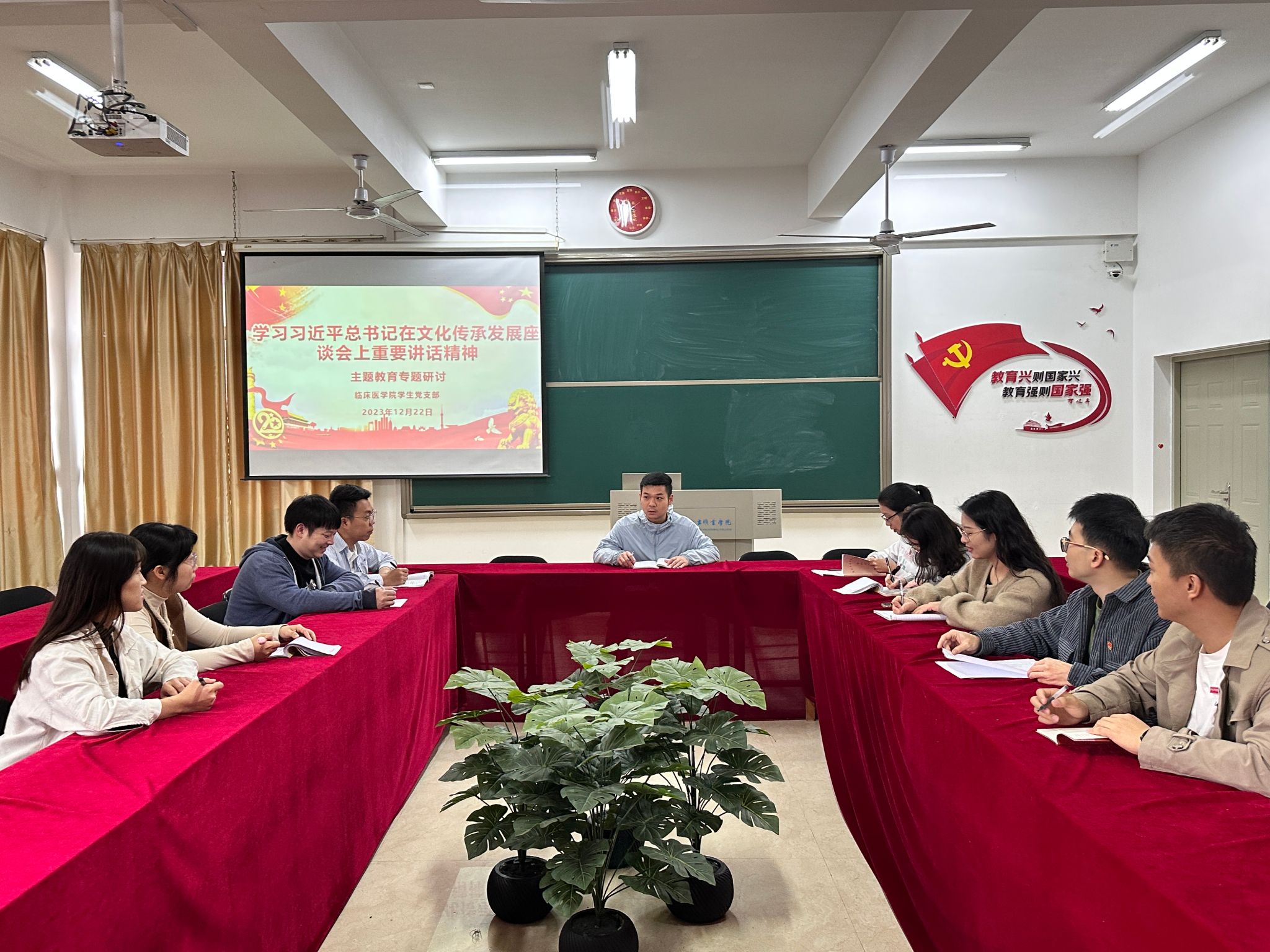 为深入学习贯彻习近平新时代中国特色社会主义思想,推动主题教育走深走实,12月22日,学生党支部举行学习习近平总书记在文化传承发展座谈会上重要讲话精神专题研讨会。学生党支部书记黄老师主持会议并作主题发言,全体支部党员参会并交流心得。