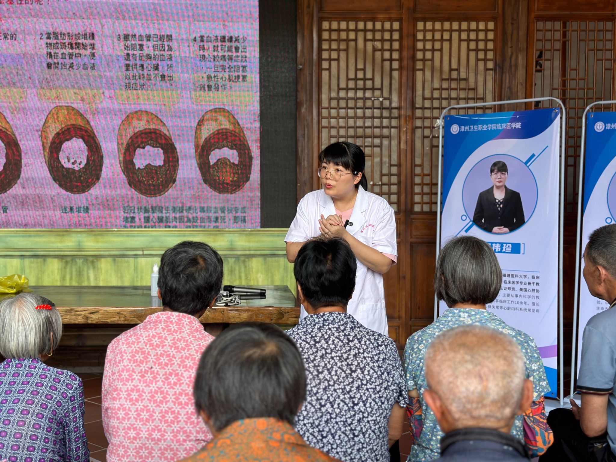 此外,实践团充分发挥专业优势,为当地村民开办了《冠心病防治健康教育知识》《识别卒中,及时就医》等健康讲座,并提供了义诊、送医送药等健康服务。此次服务涵盖车本村80%的常住人口。