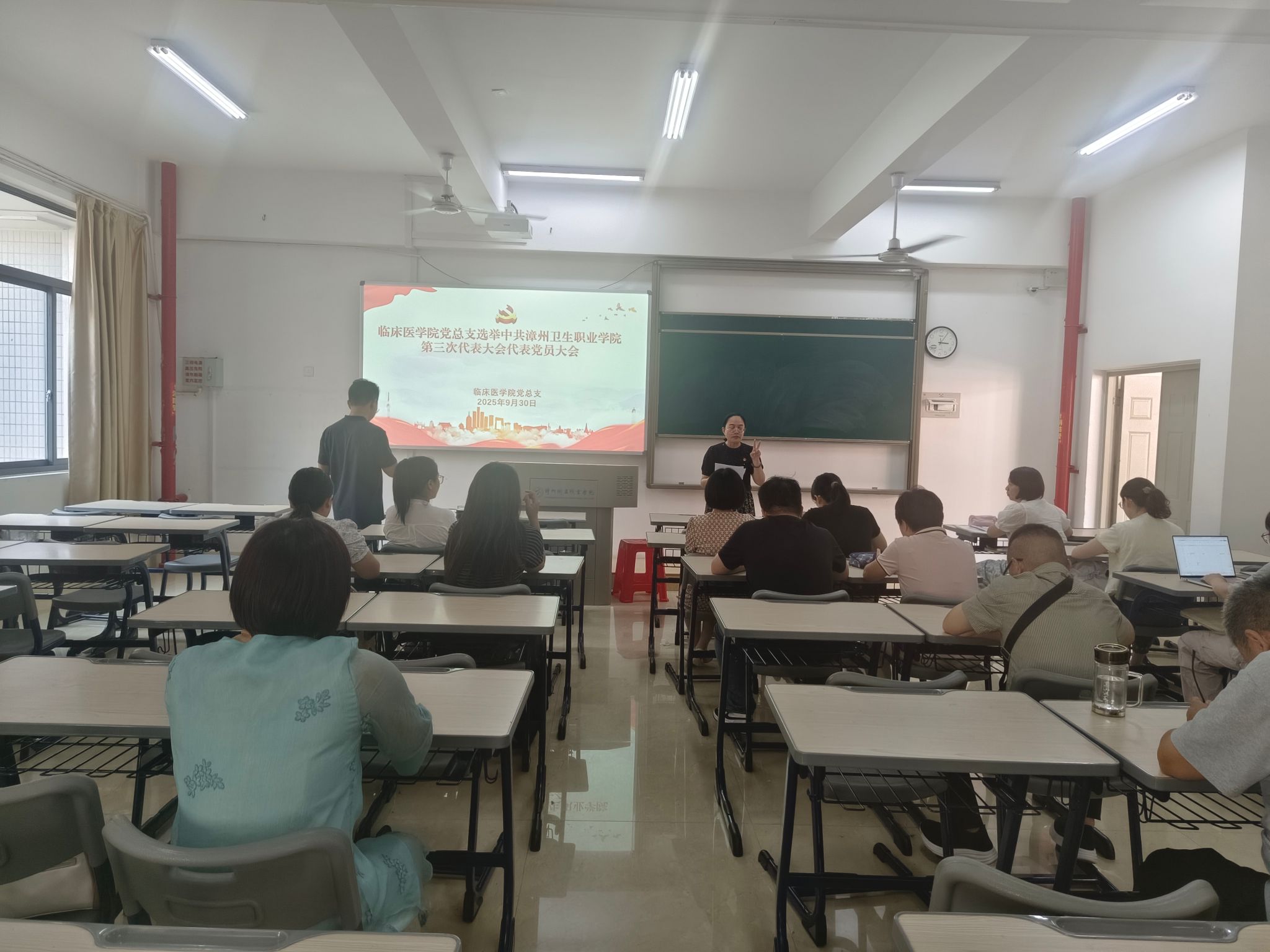 为扎实做好中共漳州卫生职业学院第三次代表大会代表选举工作,进一步发扬党内民主、凝聚基层力量,9月30日下午,临床医学院党总支在励志楼305隆重召开党员大会,选举产生出席学校第三次党代会的代表。会议由党总支书记主持,党总支全体党员参加会议。