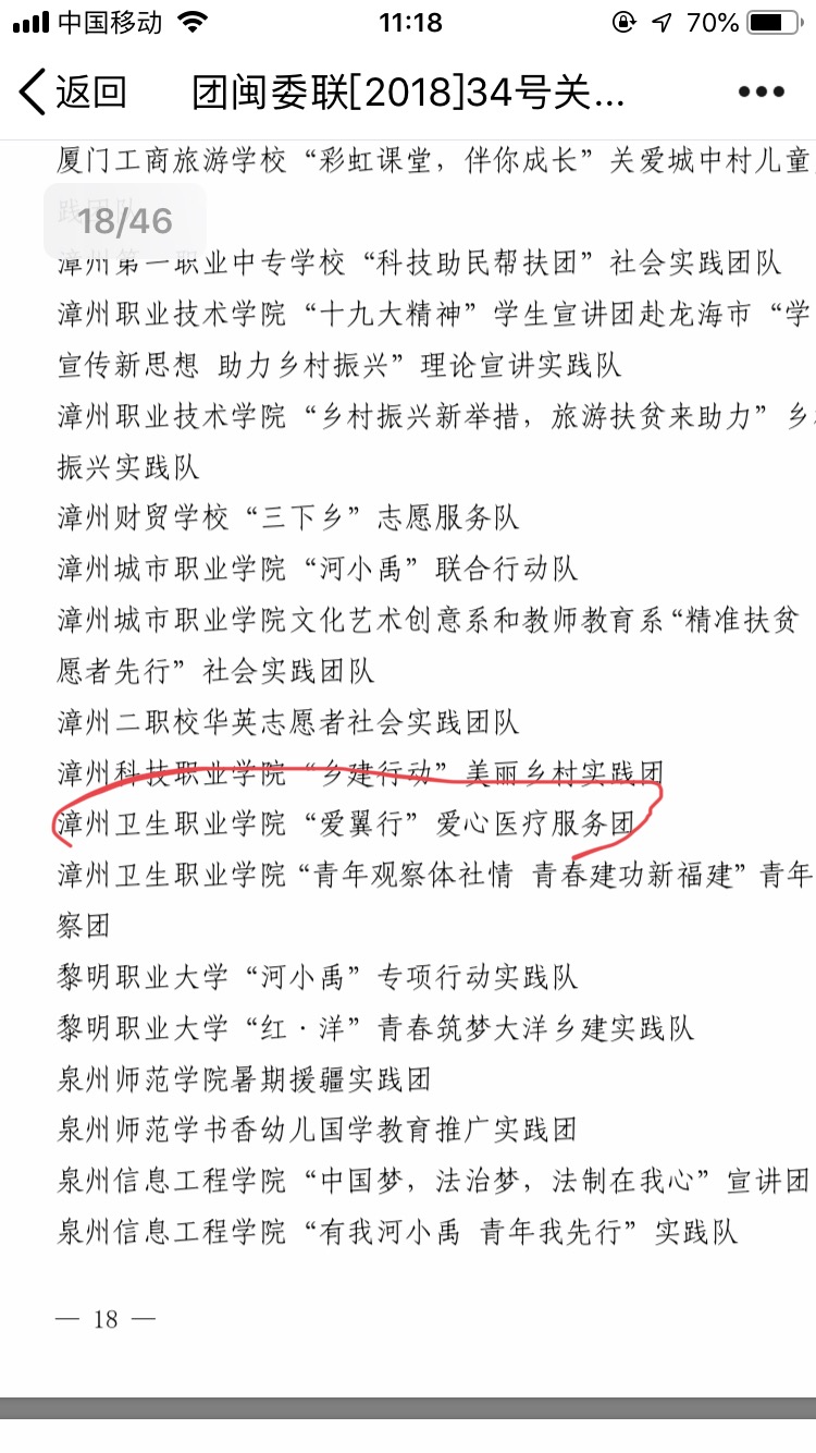 近日,由省委宣传部、省委文明办、省委教育工委、团省委、省学联组织开展的2018年省大中专学生“三下乡”社会实践活动优秀团队评选中,临床医学系“爱翼行”爱心医疗服务团凭借优异的实践表现从参加评选的3603支实践团队中脱颖而出荣获2018年省社会实践活动优秀团队。此次获奖充分肯定了我系“爱翼行”爱心医疗服务团赴漳浦县湖西畲族乡后溪村开展系列爱心服务活动的实践成效与意义。
