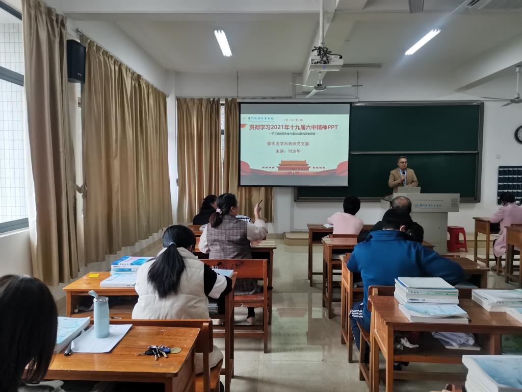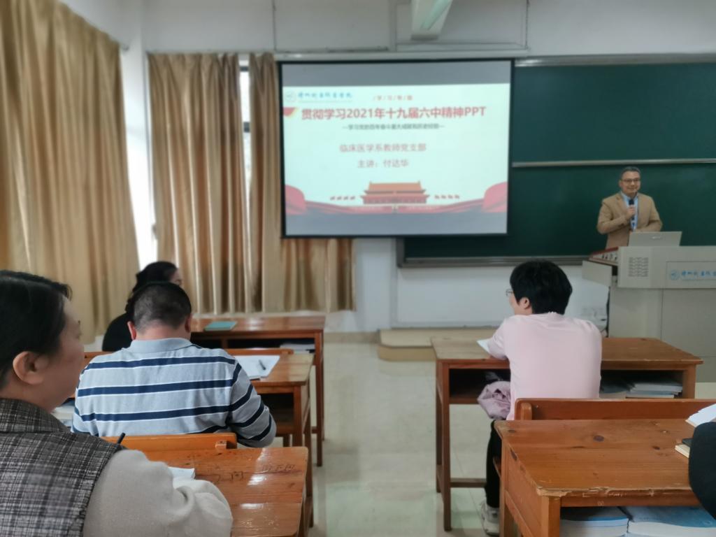 11月23日下午,临床医学系教师党支部在厚德楼305教室组织学习党的十九届六中全会精神。会议由临床医学系主任主讲,教师党支部全体党员参会。