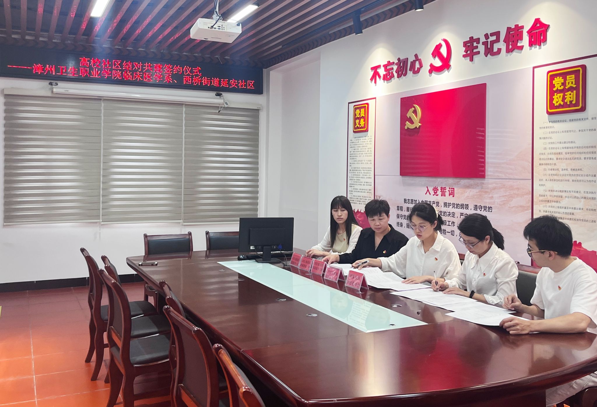 授旗仪式后,10个班级团支部前往西桥街道华南社区、西桥街道延安社区、东铺头街道龙江社区举行高校社区结对共建签约仪式。高校、社区就双方的基本情况进行了交流,就共建的形式和内容达成了共识,并签订《社区共建协议书》。双方表示以此次共建为契机,从资源共享、优势互补、服务双向、互助互建的原则出发,共同担当起大学生的思想道德建设工作和社区的精神文明建设。
