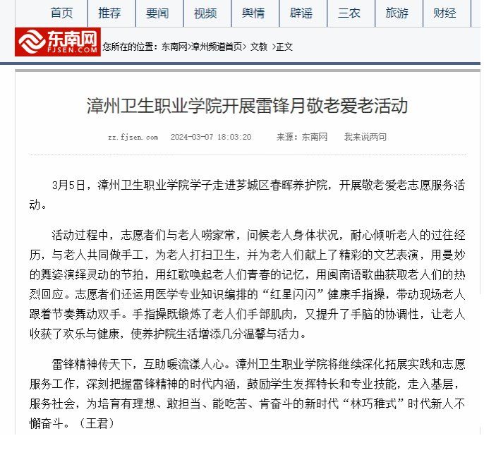 东南网:漳州卫生职业学院开展雷锋月敬老爱老活动