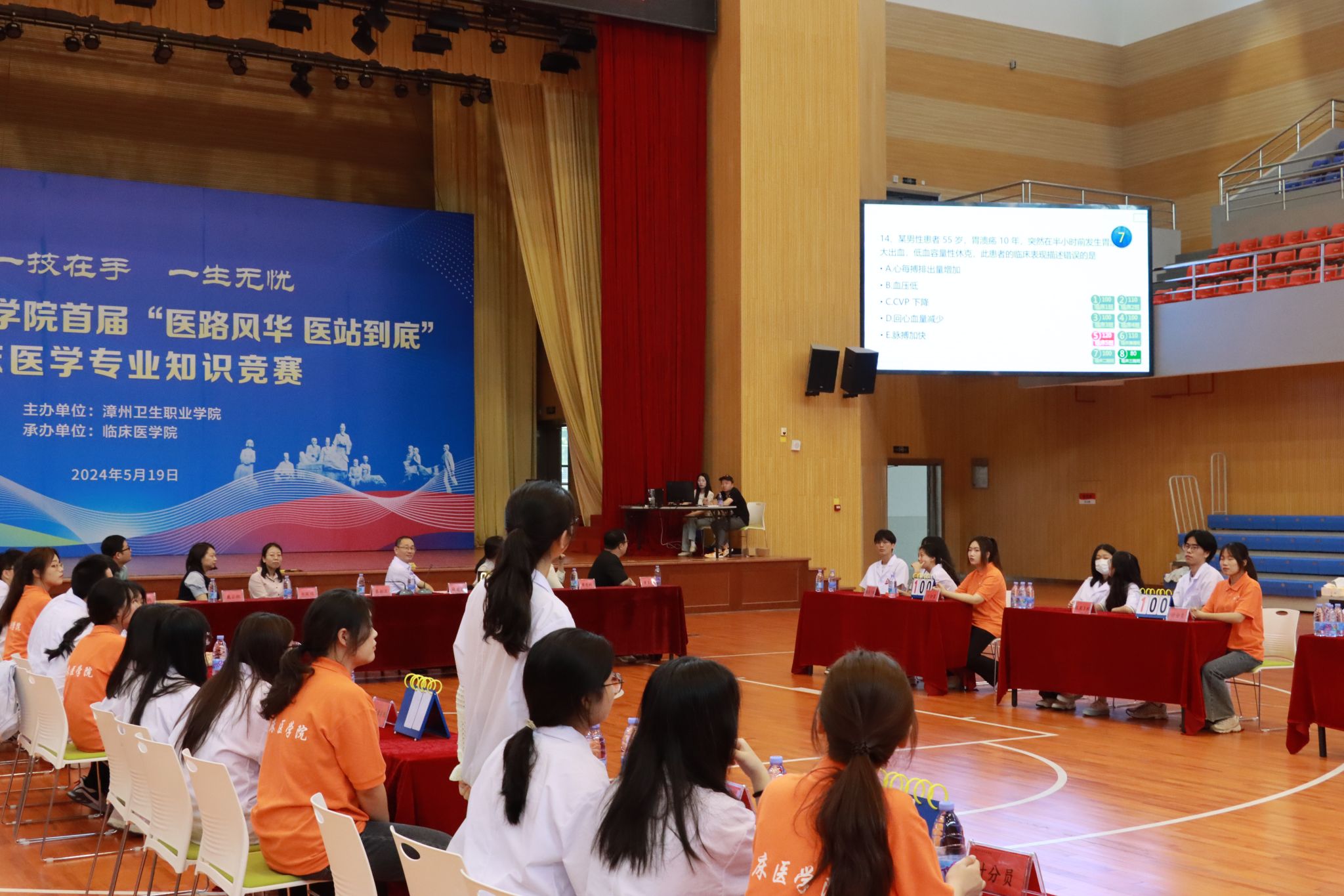 5月19日上午,我校在体育艺术中心举办首届“医路风华 医站到底”临床医学专业知识竞赛“决赛环节”比赛。副校长蔡韶滨、临床医学院党政领导班子成员和相关教师出席,各校外合作办学医院领队教师应邀参加。