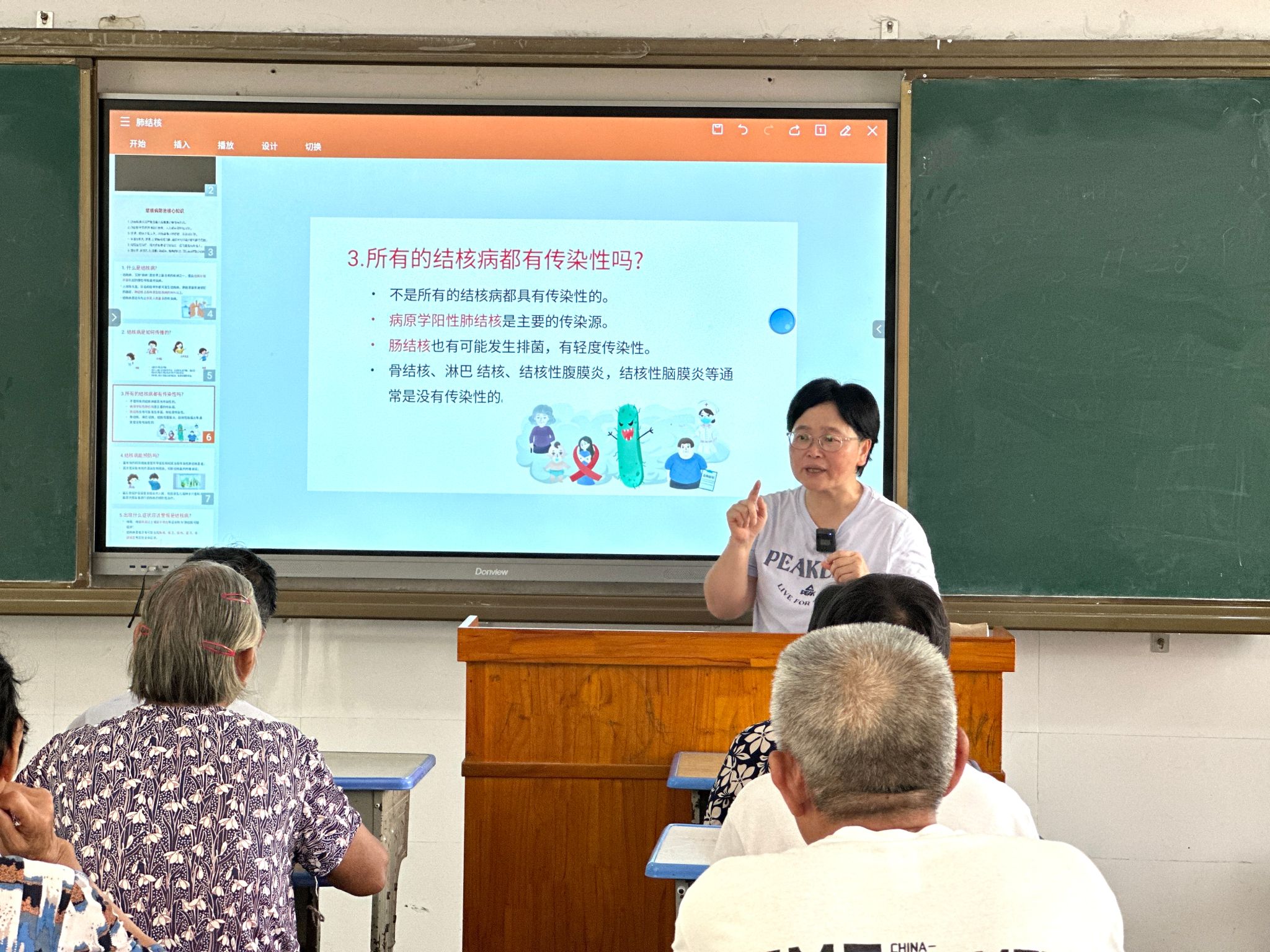 我院预防保健科副主任医师饶博士给村民们带来《社区结核病防治知识》健康小课堂,她从肺结核的常识、流行状况、主要症状、治疗与预防、农村结核病防控等几个方面,结合生动的案例、确切的数据和宣传视频,深入浅出的讲解了农村肺结核防治的重要性和必要性,并强调肺结核防治务必做到早发现早治疗。