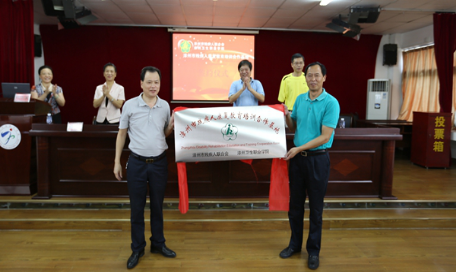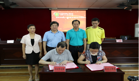随后,周建明理事长、沈小美副院长代表双方签订合作协议。林忠书记接过“漳州市残疾人康复教育培训合作基地牌”。