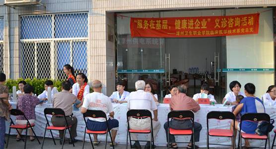 10月17日,临床医技系党总支书记带领系党员教师、学生志愿者于漳州市电业局联合开展“服务在基层,健康进企业”健康义诊咨询服务活动,此次活动是临床医技系党总支“专业服务社会,健康进基层”——建设服务型基层党组织的立项系列活动之一。活动中,充分利用临床医技系的专业优势,带领教师走进企业,深入社会,延长专业触角,不断提高专业服务社会的能力,进一步拉近了学院与社会的联系,提高了学院的社会影响力,为临床医技系建设服务型基层党组织夯实了有力的基础。