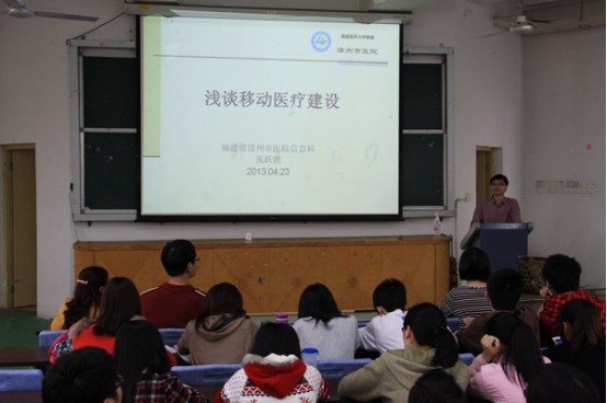 4月23日下午,临床医学技术系在明德楼3教举办《浅谈移动医疗建设》专题讲座,讲座邀请了福建医科大学附属医院漳州市医院信息科科长张跃能高级工程师主讲,临床医学技术系卫生信息管理、临床医学等专业学生和部分教师约250人聆听本次讲座。