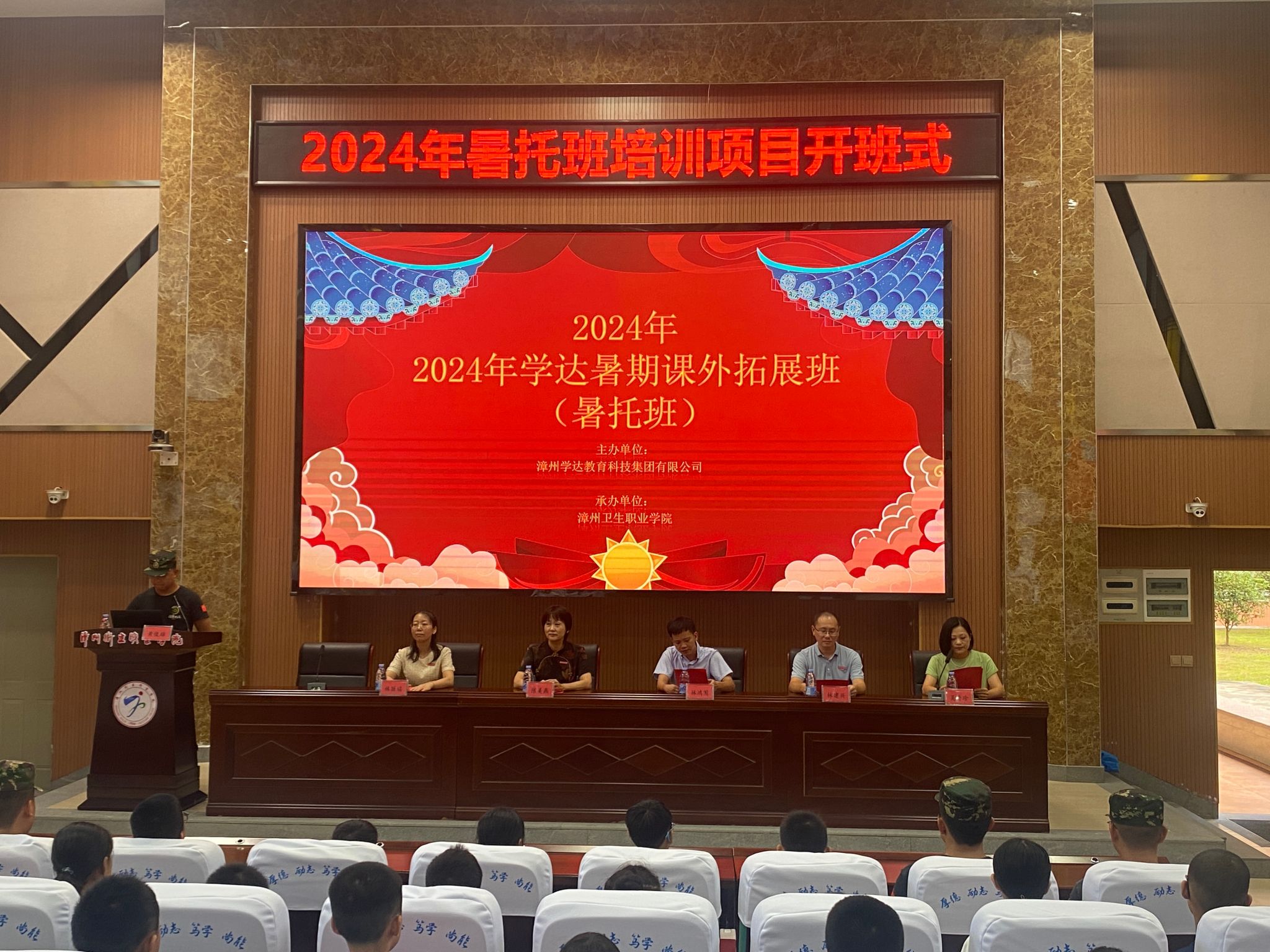 开班仪式上,漳州学达教育科技集团负责人林鸿图发表致辞,他首先对承办此次项目的工作人员表示感谢,他指出本次暑托班旨在通过丰富多彩的课程和活动,为同学们提供一个安全、健康、快乐的成长环境,希望各位同学能够严格遵守暑托班各项管理制度、增强安全意识、积极参加各项活动,并祝愿参与暑托班的同学们能够度过一个愉快、充实的暑假。随后,由本次暑托班总教官带领同学进行安全宣誓。最后,参加开班仪式的工作人员及学生共同参观了此次暑托班的教室、宿舍、食堂等。