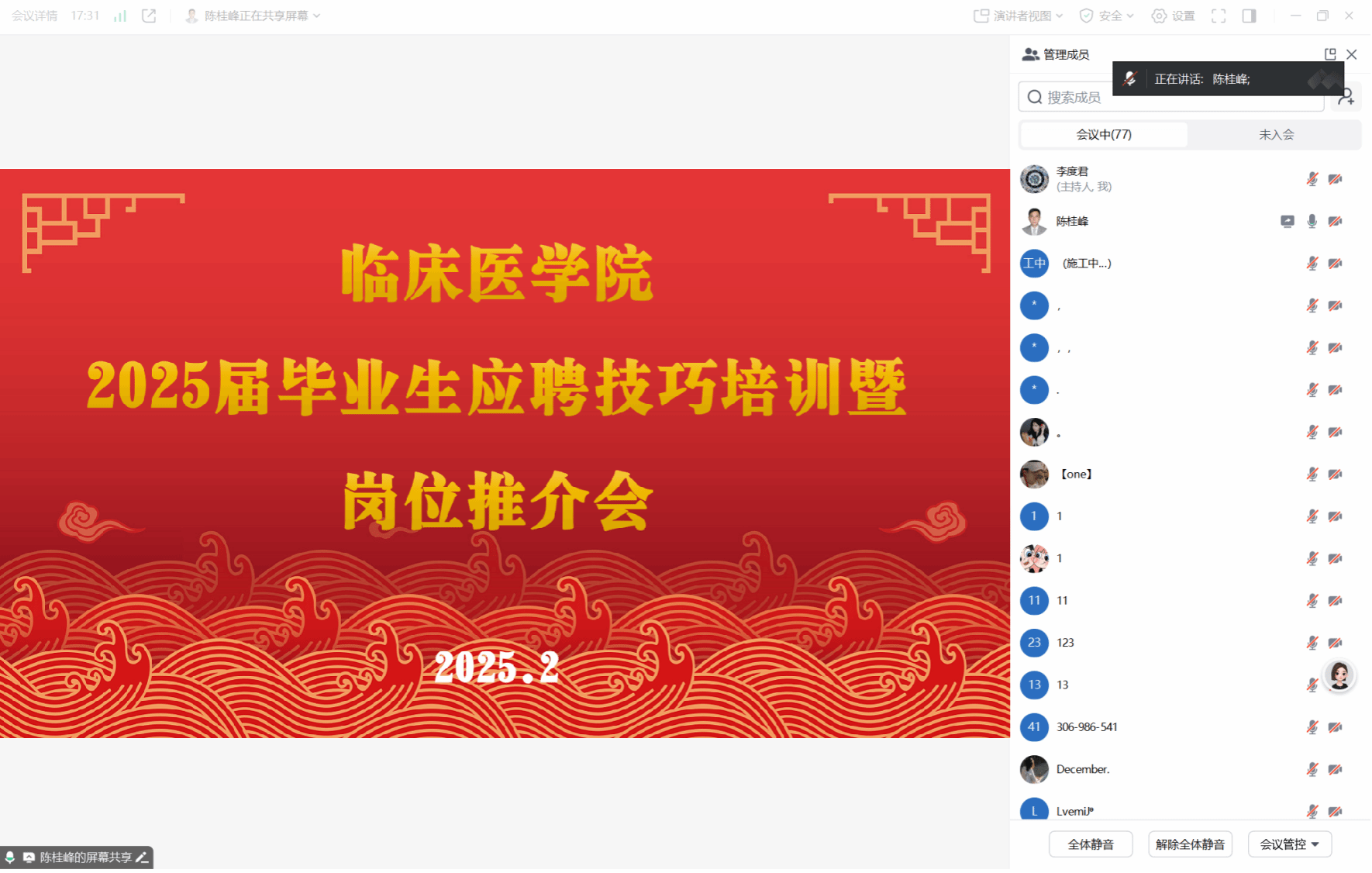 为全面做好毕业生就业指导工作,提高毕业生求职面试技巧,进一步增强就业竞争力,2月13日晚,临床医学院召开应聘技巧专题培训暨岗位推介会。本次培训会特邀拥有18年培训咨询工作经验的企业培训官陈桂峰作为主讲嘉宾,学院2025届毕业生参加。