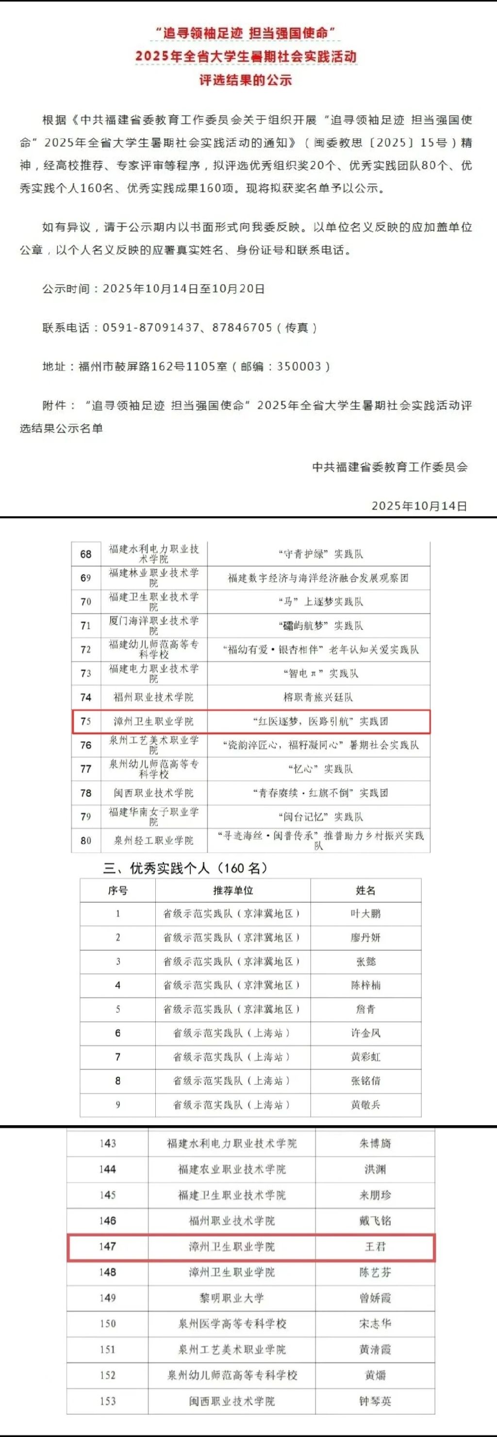 近日,中共福建省委教育工作委员会正式公布“追寻领袖足迹 担当强国使命”2025年全省大学生暑期社会实践活动评选结果。由我院教师王君、王世凤、张旻联合指导的“红医逐梦,医路引航”实践团,凭借扎实深入的实践内容、成效显著的社会服务成果以及紧密高效的团队协作精神,成功获评“优秀实践团队”,王君老师获评“优秀实践个人”。