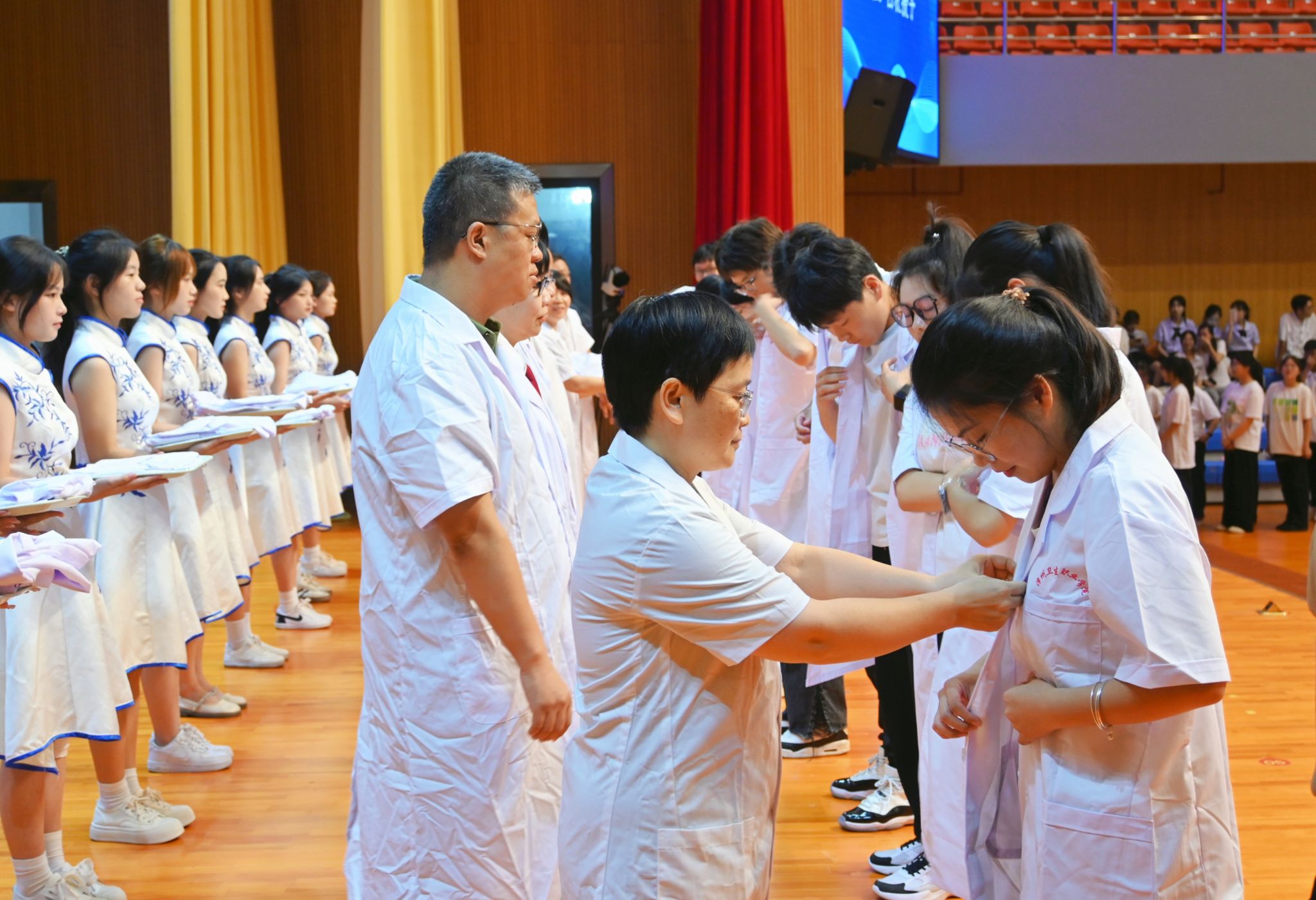 在全校深入开展学习贯彻习近平新时代中国特色社会主义思想主题教育之际,为引导新时代医学生在医学道路上开好局、起好步,9月21日,我院举行2023级新生白衣授予暨医学体验日活动,学校副校长蔡韶滨,校外嘉宾代表,临床医学院党政班子、部分教师代表及2023级全体新生参加活动。