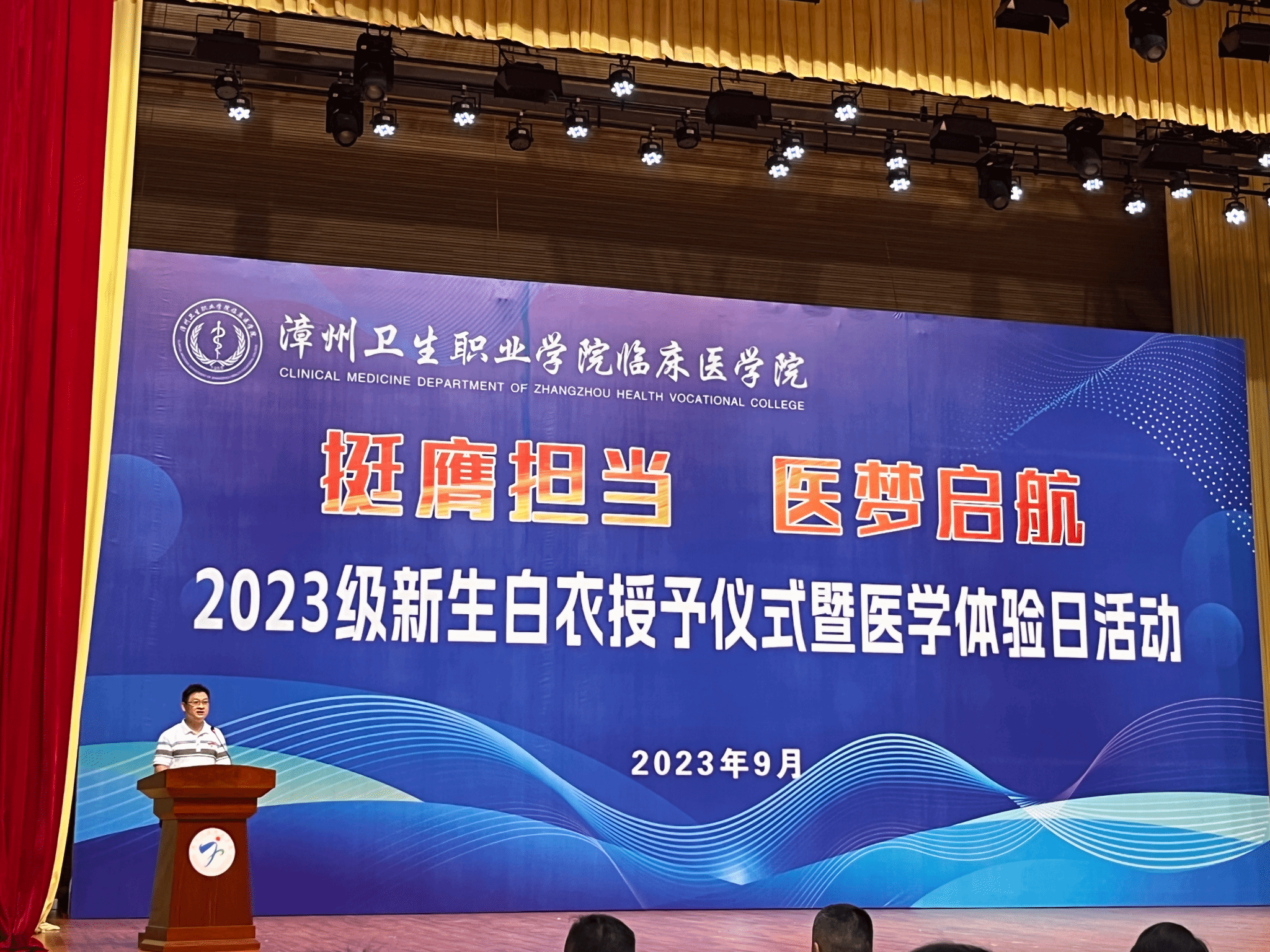 活动伊始,来自漳州市医院、漳州三院等临床专家及学院教师为新生代表授予白衣,全体医学生庄严宣誓。蔡韶滨在会上发言,他强调,全体同学要牢记使命,不忘“医路”初心。始终保持对医学的赤忱热爱和执着追求,坚持以人为本,不负“健康所系,性命相托”的医学生誓言。要脚踏实地,提升“医路”本领。以不怕吃苦的精神,把基础知识学扎实,坚持独立思考和自主学习,厚积薄发,广博方可致远。要勇追梦想,担起“医路”使命。时刻保持对医学新知识的渴望,挖掘医学深度,拓展医学宽度,提升从医温度,涵养心智,恪守医道。随后,漳州市医院副院长林聪猛代表一线临床工作者勉励青年医学生,要严谨求学、勇攀医学高峰,精进知识和技能,永葆仁爱之心,做一个坚定的“杏林守望者”。