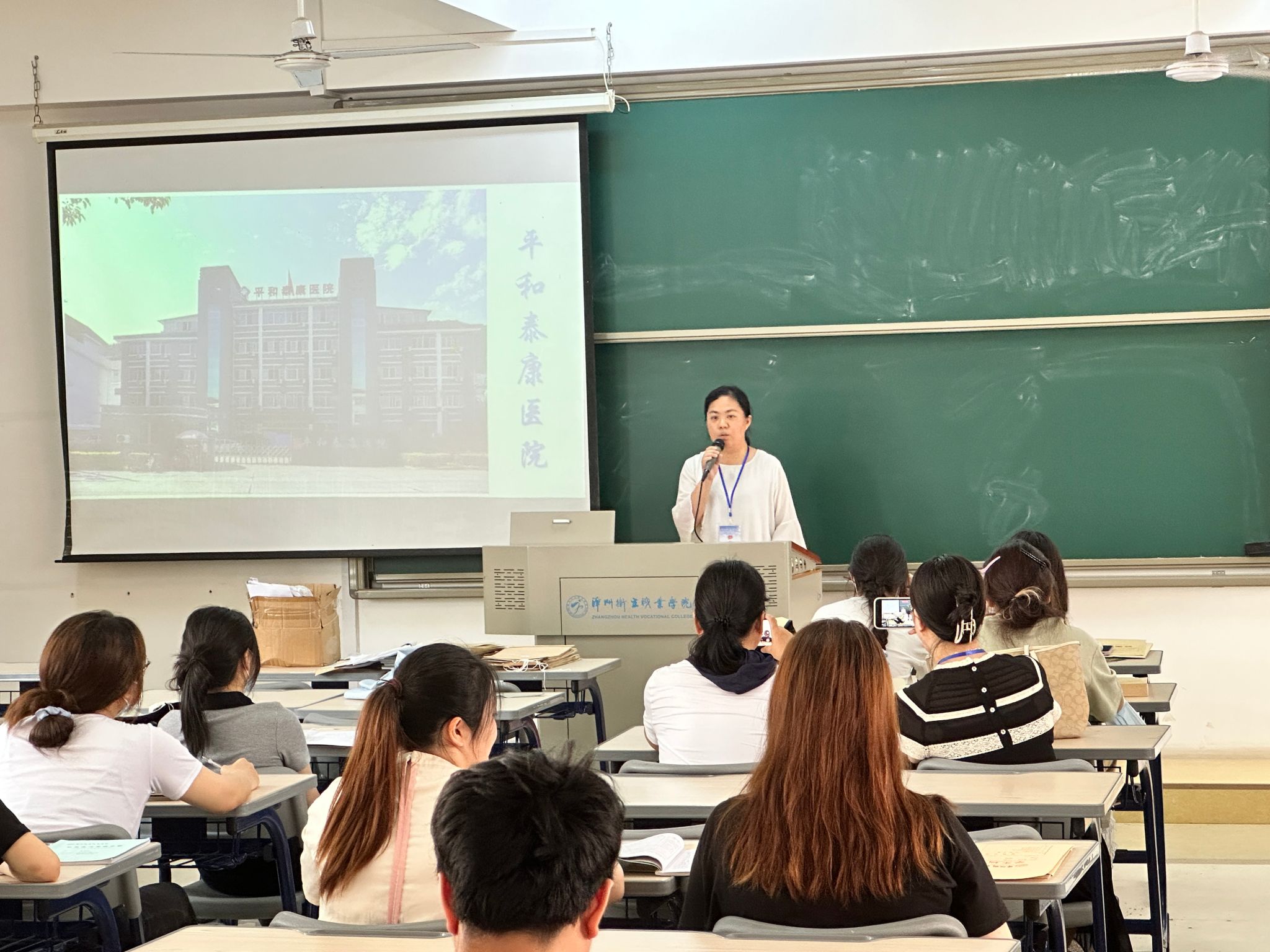 会上,诏安安定康复医院钟副院长首先对精神病医院的行业发展、医护团队和治疗方法进行了简要介绍。随后,平和泰康医院蔡院长、长泰慧康医院人事处江主任分别分享了她们在精神病医院的工作经历及成长感悟,并介绍医院的基础设施和工作环境。最后,宣讲团从精神病医院工作特点、工作条件、员工的职业发展和成长路径三个方面进行全面讲解,并指出医院提供具有竞争力的薪酬福利、全面的培训和锻炼机会、广阔的发展空间,鼓励同学们积极应聘。