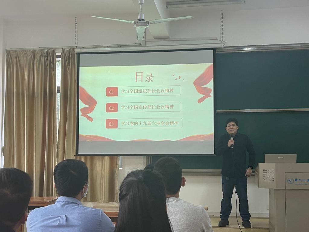 会上,陈老师详细解读了全国组织部长会议、全国宣传部长会议和十九届六中全会精神,并总结了四大要点,一是要深入学习贯彻习近平新时代中国特色社会主义思想,增强“四个意识”,坚定“四个自信”、做到“两个维护”;二是要切实加强组织部门自身建设,提高政治判断力、政治领悟力、政治执行力;三是在新时期要把握好新形势新任务,把工作融入党和国家事业大局,扎实做好党的思想宣传和党的建设工作,守正创新,勇开新局;四是要深刻认识党的百年奋斗历程的历史意义和历史经验,以史为鉴,开创未来。陈老师表示,作为高校思政工作者,要坚持以党的政治建设为统领,持续深入学习习近平新时代中国特色社会主义思想,增强思想自觉和行动自觉,做到学用结合,切实做好立德树人工作。