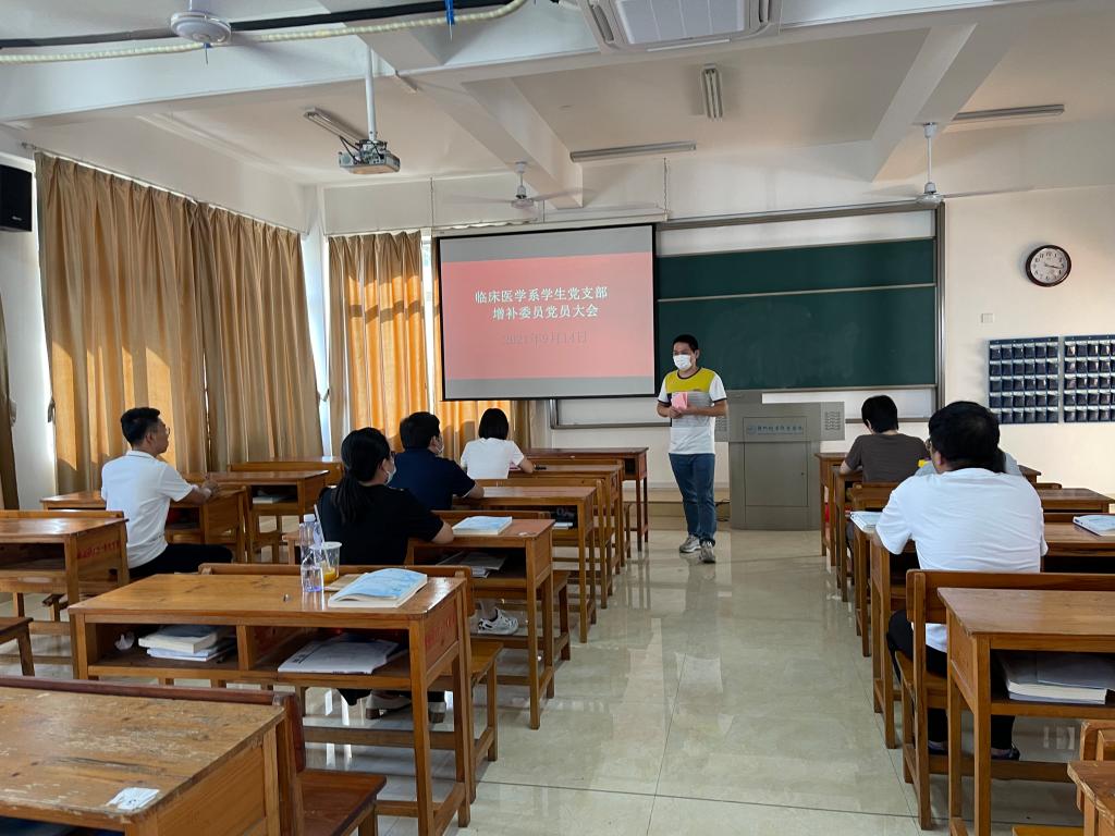 依照《同意口腔医学系党支部、临床医学系学生党支部、健保系教师党支部、健保系学生党支部、机关第二党总支第二党支部委员选举党员大会及候选人预备人选的批复》(漳卫职委〔2021〕73号)文件,按照党章规定和学院党委的部署,临床医学系学生党支部于2021年9月14日召开支部党员大会增补支部委员。会议由支部书记主持,全体支部党员参会。