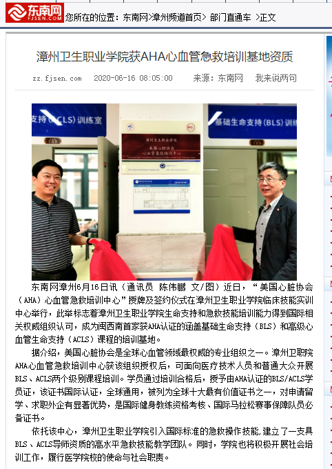 2020年6月16日,《东南网》漳州频道,报道了我院成功获得AHA心血管急救培训基地资质。具体报道如下: