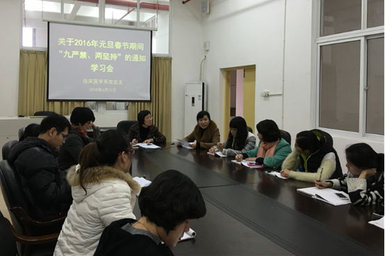 为进一步深化落实中央八项规定精神,弘扬风清气正、廉洁从教、文明节俭、为人师表的良好风尚,1月11日下午,临床医学系在系部会议室召开“关于2016年元旦春节期间‘九严禁、两坚持’的通知”学习会,党总支书记颜晓萍主持会议,全体教师参加会议。