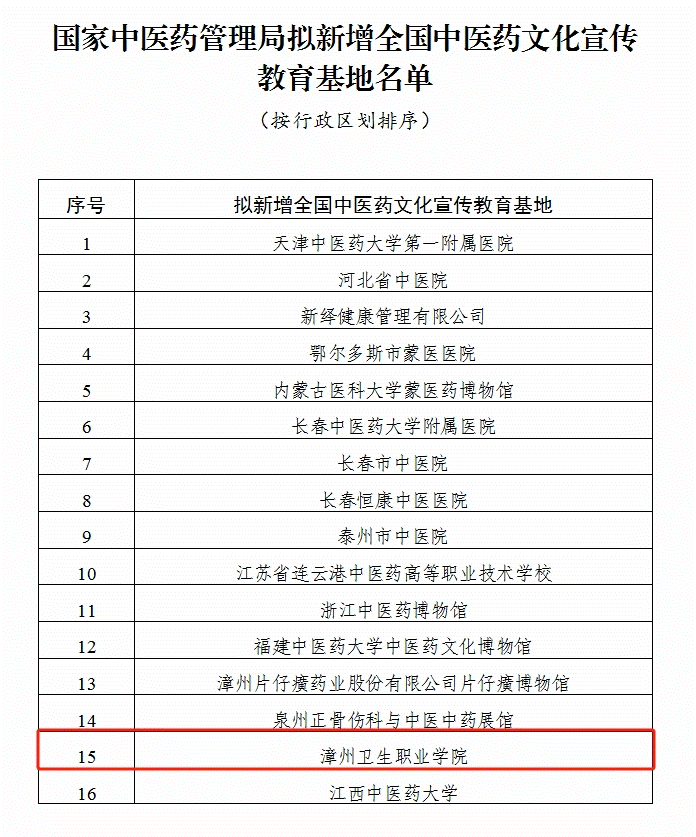 近日,国家中医药管理局公示了2024年拟新增的39家全国中医药文化宣传教育基地单位名单。我校成功入选全国中医药文化宣传教育基地。