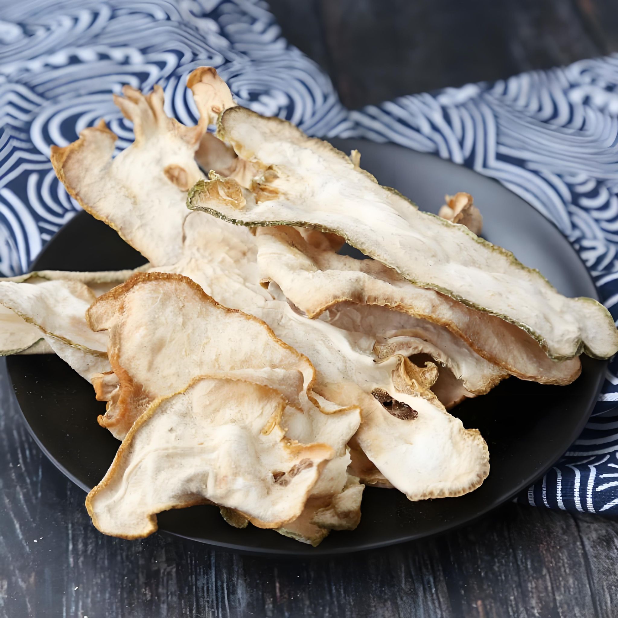 【性状】本品为类椭圆形、卵圆形的薄片或不规则的丝条,常皱缩或卷曲。薄片长6~10cm,宽3~7cm,厚0. 2~ 0. 4cm;顶端稍宽,常有3~5个手指状的裂瓣,基部略窄,有的可见果梗痕。丝长0.4~10cm,宽0.2~1cm,厚0. 2~ 0.4cm。外皮黄绿色或橙黄色,有皱纹和油点。果肉浅黄白 色或浅黄色,散有凹凸不平的线状或点状维管束。质硬而脆, 受潮后柔韧。气香,味微甜后苦。