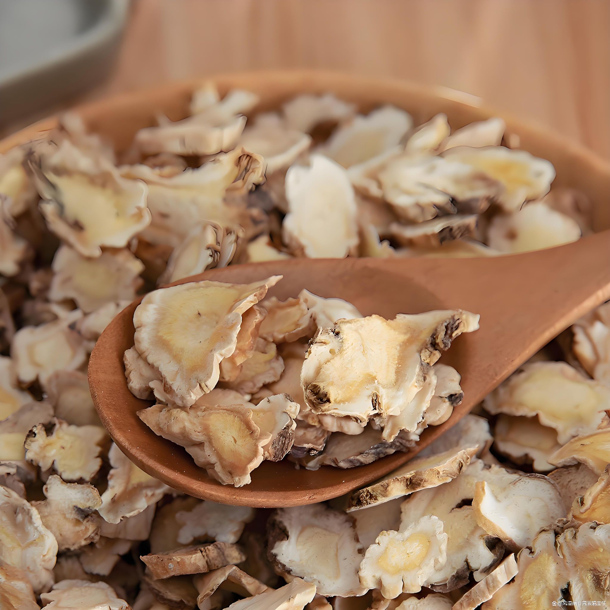 本品为斜椭圆形或不规则薄片,外皮多已除去或偶有残留。切面皮部淡黄白色,较窄;形成层环纹明显,淡褐色;木部宽,有较多裂隙。质脆,易析断。照上述[含量测定]项下的方法测定,含总皂苷不得少于5.5%。