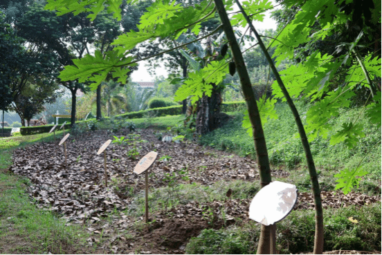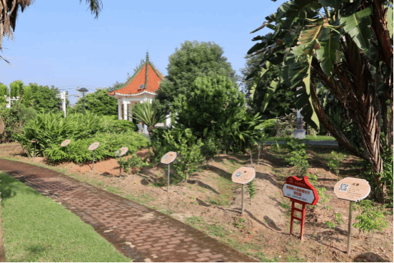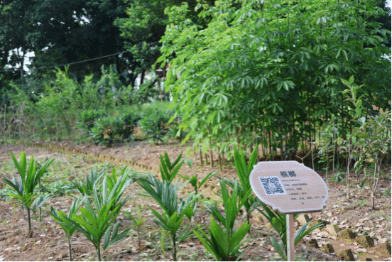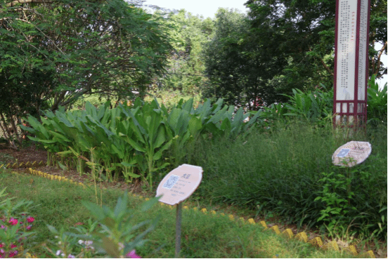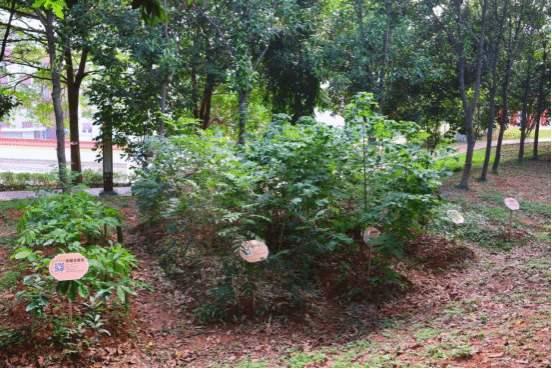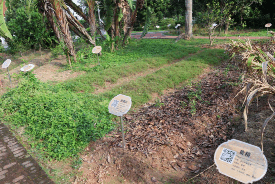 “金园”种植区种有药用植物共12种,包括林娜果、旱伞树、草珊瑚、粉花绣线菊、姜、金果榄、桔梗、腊梅、连翘、天冬、朱砂根、紫苏。
