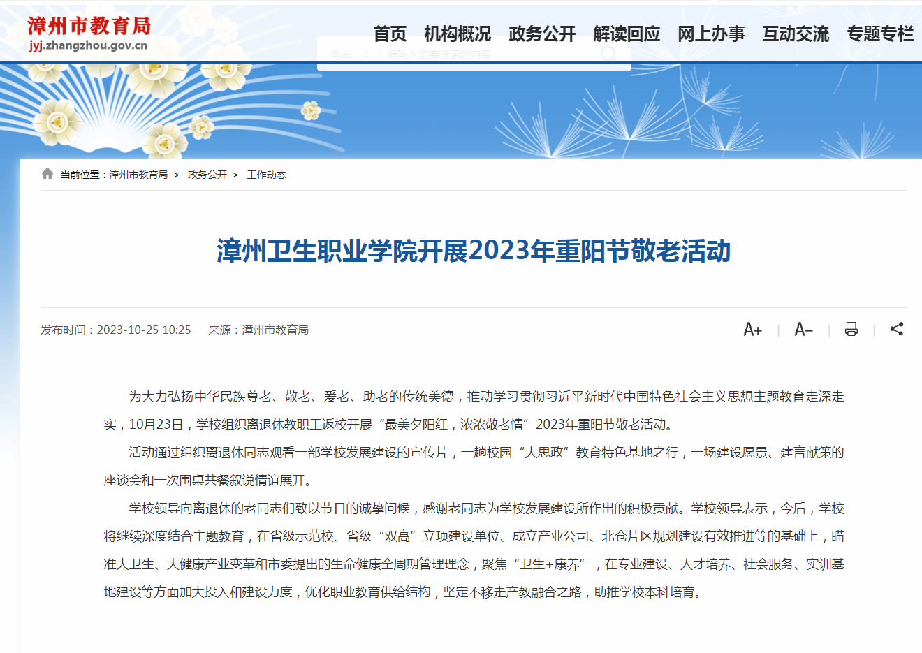 漳州市教育局:漳州卫生职业学院开展2023年重阳节敬老活动