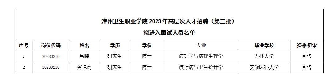 根据《漳州卫生职业学院2023年高层次人才招聘方案》,经资格审核,吕鹏、冀艳虎同志符合报考岗位条件,拟进入面试,现予以公示。公示期如有异议,请及时来电反映。