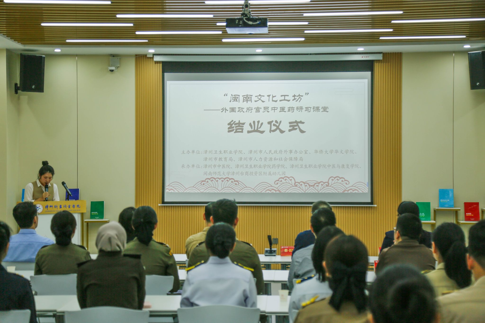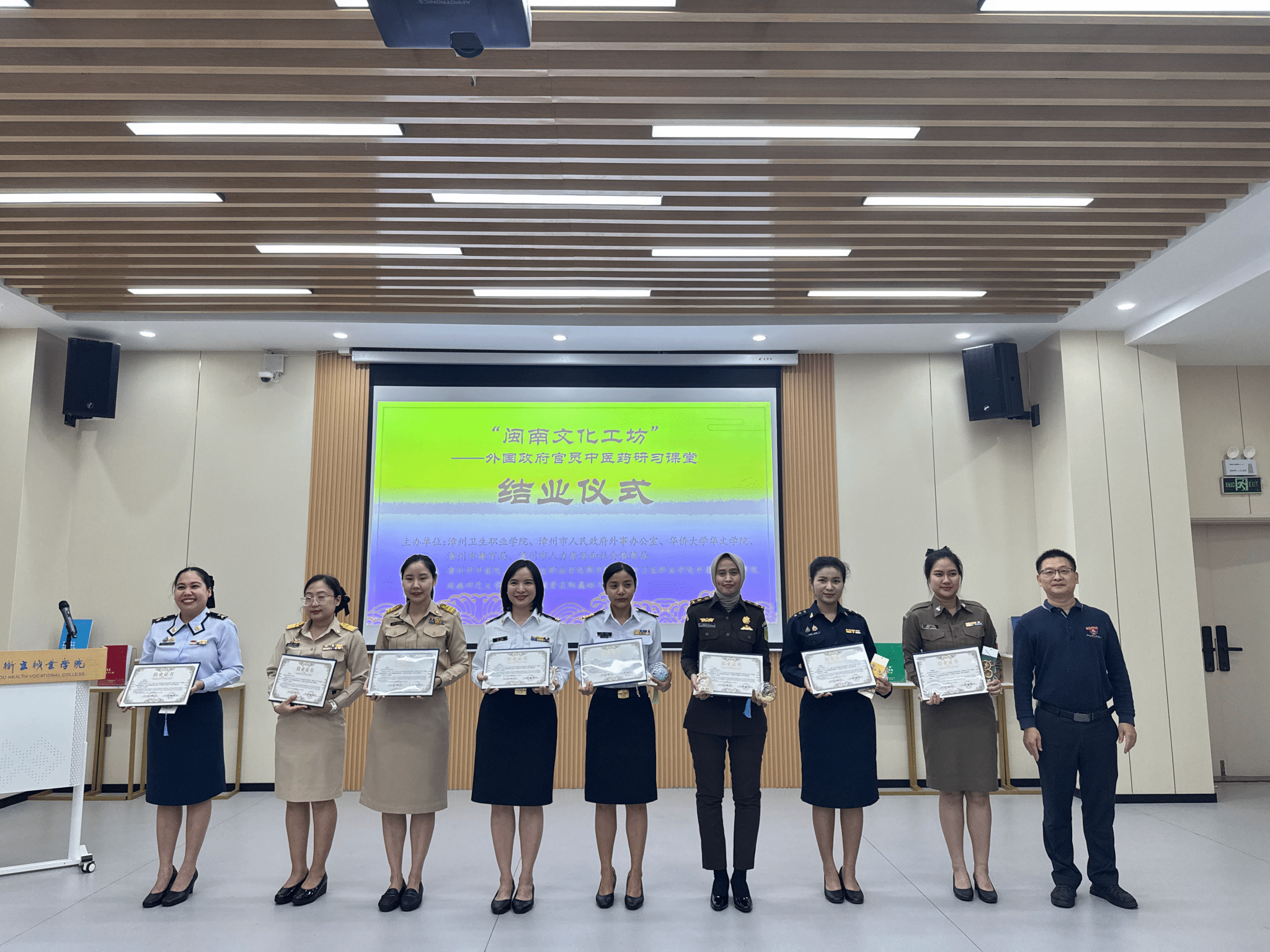 11月18日,历时五天的“福连五洲,岐黄薪传”外国官员中医药研习课堂在我校顺利结业。漳州市外事办主任杨尚庞、学校副校长蔡韶滨、华侨大学华文学院党委书记袁媛出席结业仪式。