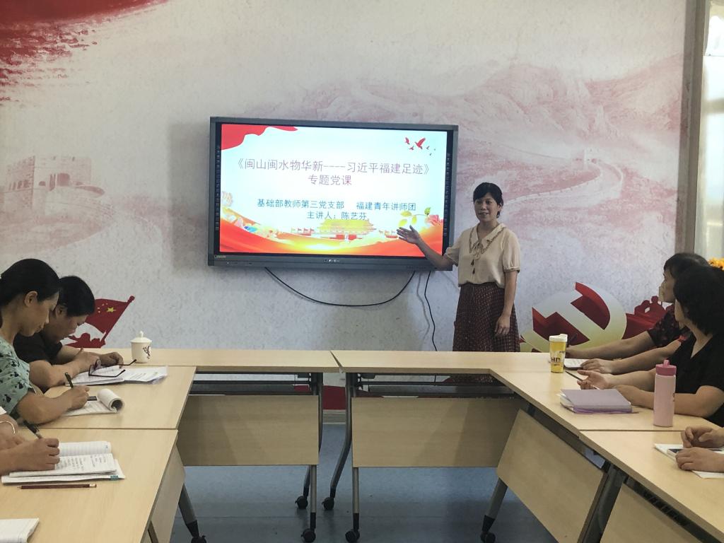 6月28日下午,基础部教师第三支部在党建活动中心开展了《闽山闽水物华新--- 习近平福建足迹》专题党课学习,由福建青年讲师团、漳州青年讲师团成员、基础部教师第三党支部书记主讲。