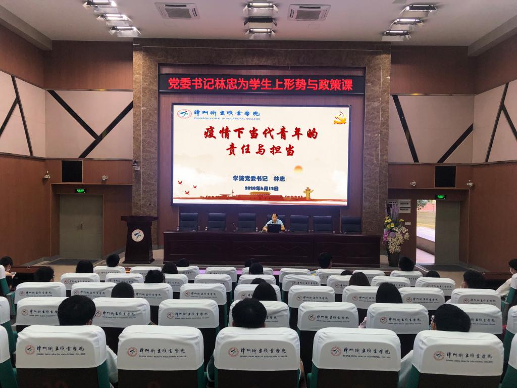 6月12日下午,学院党委书记林忠以《疫情下当代青年的责任和担当》为主题,在学术报告厅为18级护理学生讲授《形势与政策》课。