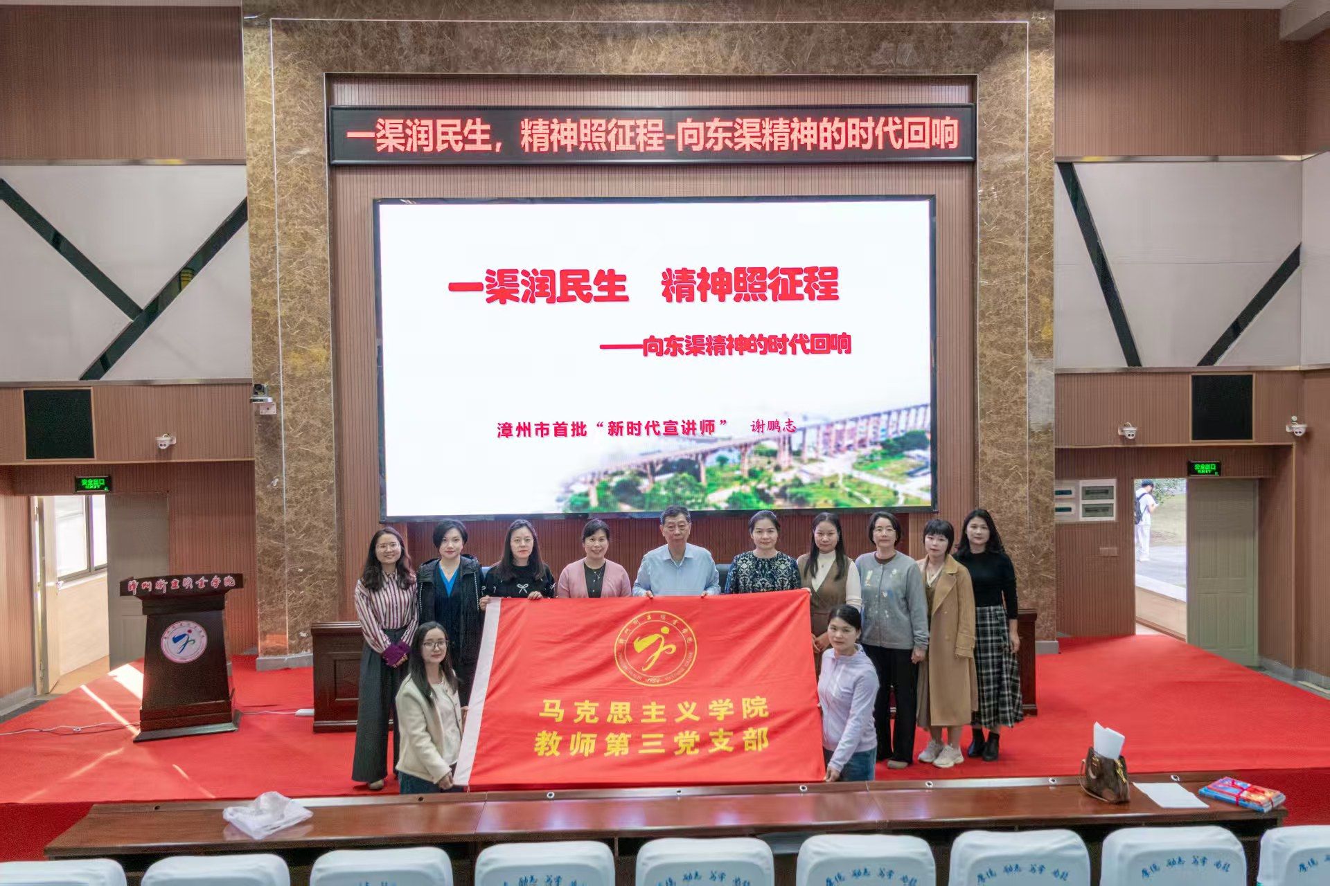 为深化党史学习教育成果,推动红色思政教育与支部建设深度融合,引导党员师生从本土红色资源中淬炼党性修养,12月9日,教师第三党支部以“一渠润民生,精神照征程——向东渠精神的时代回响”为主题,开展主题党日活动。活动特别邀请漳州市首批新时代宣讲师、向东渠事迹展示馆馆长谢鹏志作专题讲座,支部全体党员、青年马克思主义学社、习近平新时代中国特色社会主义思想读书社成员参加此次学习,在红色精神滋养中筑牢信仰之基。